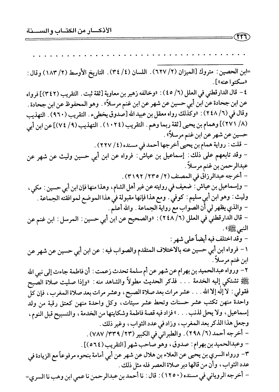 ٤ - قال الدارقطني في العلل (٦/ ٤٥):» وخالفه زهير بن معاوية [ثقة ثبت. التقريب (٣٤٢)] فرواه عن إبن جحادة عن أبي حسين عن شهر عن ابن غنم مرسلا «. وهو المحفوظ عن ابن جحادة. وقال في (٦/ ٢٤٨):» وكذلك رواه معقل بن عبيد الله [صدوق يخطئ. التقريب (٩٦٠). التهذيب (٨/ ٢٧١)] وهمام بن يحيى [ثقة ربما وهم. التقريب (١٠٢٤). التهذيب (٩/ ٧٤)] عن ابن أبي حسين عن شهر عن ابن غنيم مرسلا «.