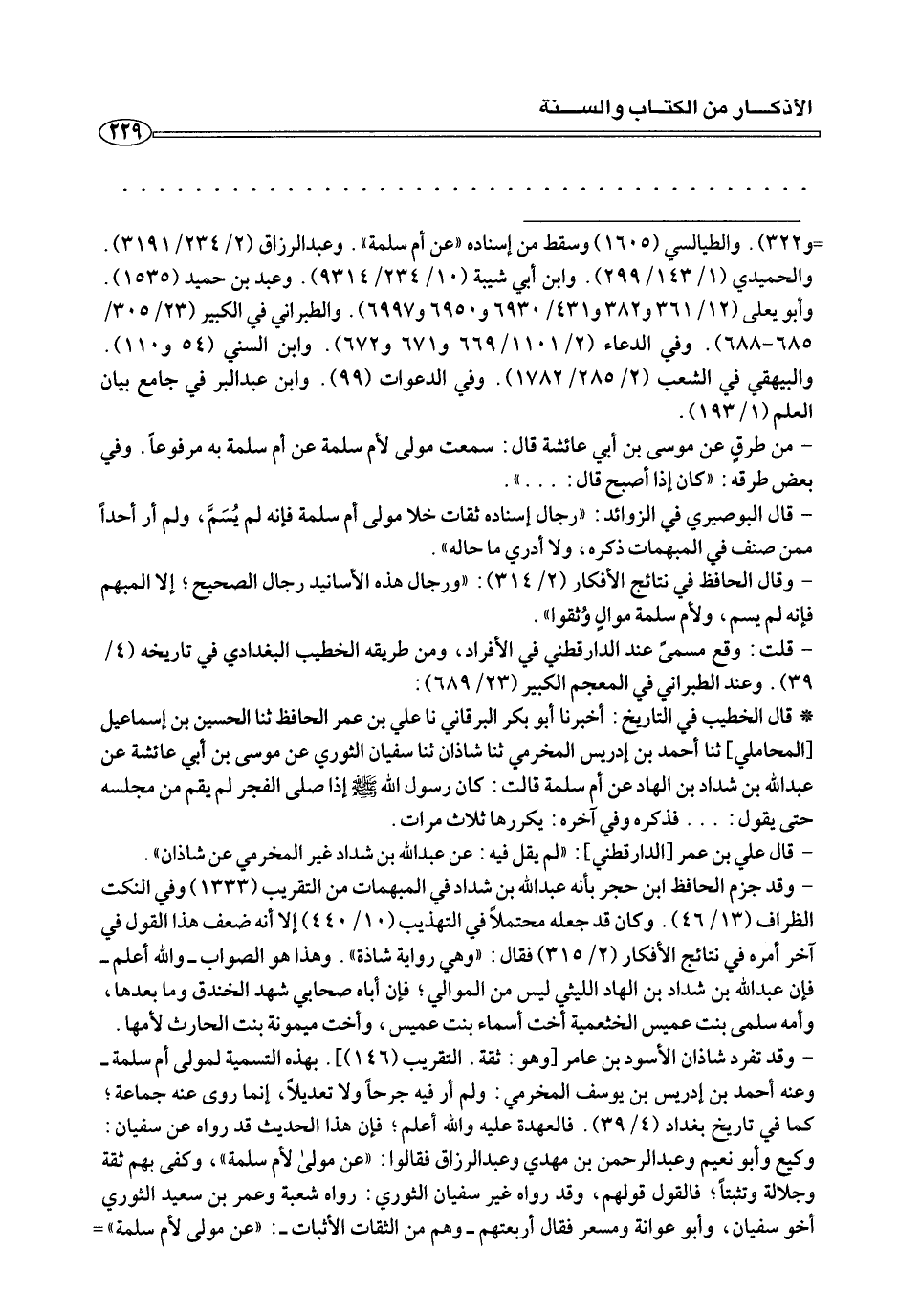 * قال الخطيب في التاريخ: أخبرنا أبو بكر البرقاني نا علي بن عمر الحافظ ثنا الحسين بن إسماعيل] المحاملي] ثنا أحمد بن إدريس المخرمي ثنا شاذان ثنا سفيان الثوري عن موسى بن أبي عائشة عن عبد الله بن شداد بن الهاد عن أم سلمة قالت: كان رسول الله صلى الله عليه وسلم إذا صلى الفجر لم يقم من مجلسه حتى يقول: ... فذكره وفي آخره: يكررها ثلاث مرات.