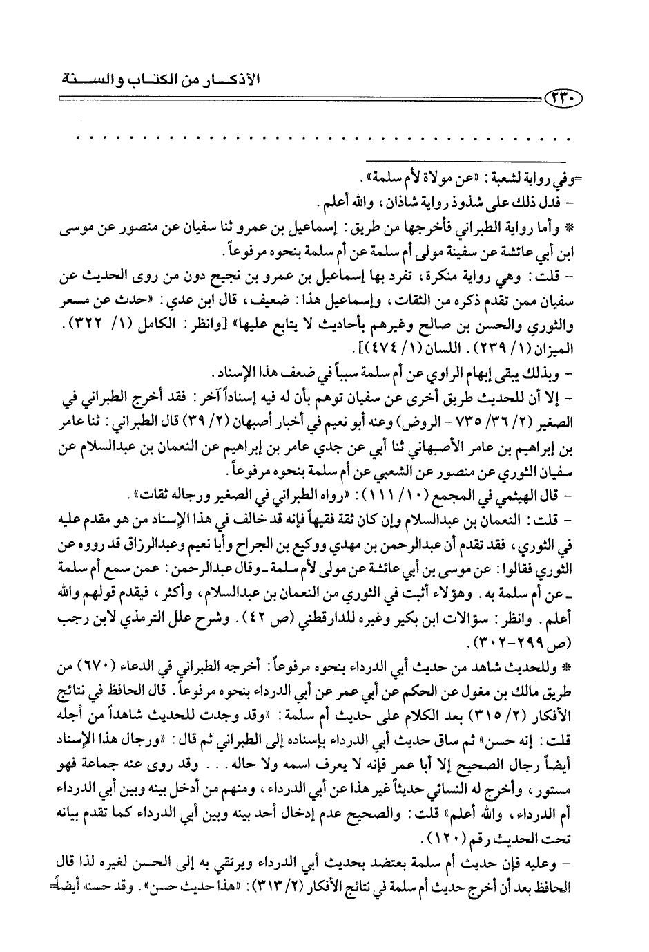 - قلت: النعمان بن عبد السلام وإن كان ثقة فقيهًا فإنه قد خالف في هذا الإسناد من هو مقدم عليه في الثوري، فقد تقدم أن عبد الرحمن بن مهدي ووكيع بن الجراح وأبا نعيم وعبد الرزاق قد رووه عن الثوري فقالوا: عن موسى بن أبي عائشة عن مولى لأم سلمة- وقال عبد الرحمن: عمن سمع أم سلمة- عن أم سلمة به. وهؤلاء أثبت في الثوري من النعمان بن عبد السلام، وأكثر، فيقدم قولهم والله أعلم. وانظر: سؤالات ابن بكير وغيره للدارقطني (ص ٤٢). وشرح علل الترمذي لابن رجب (ص ٢٩٩ - ٣٠٢).
