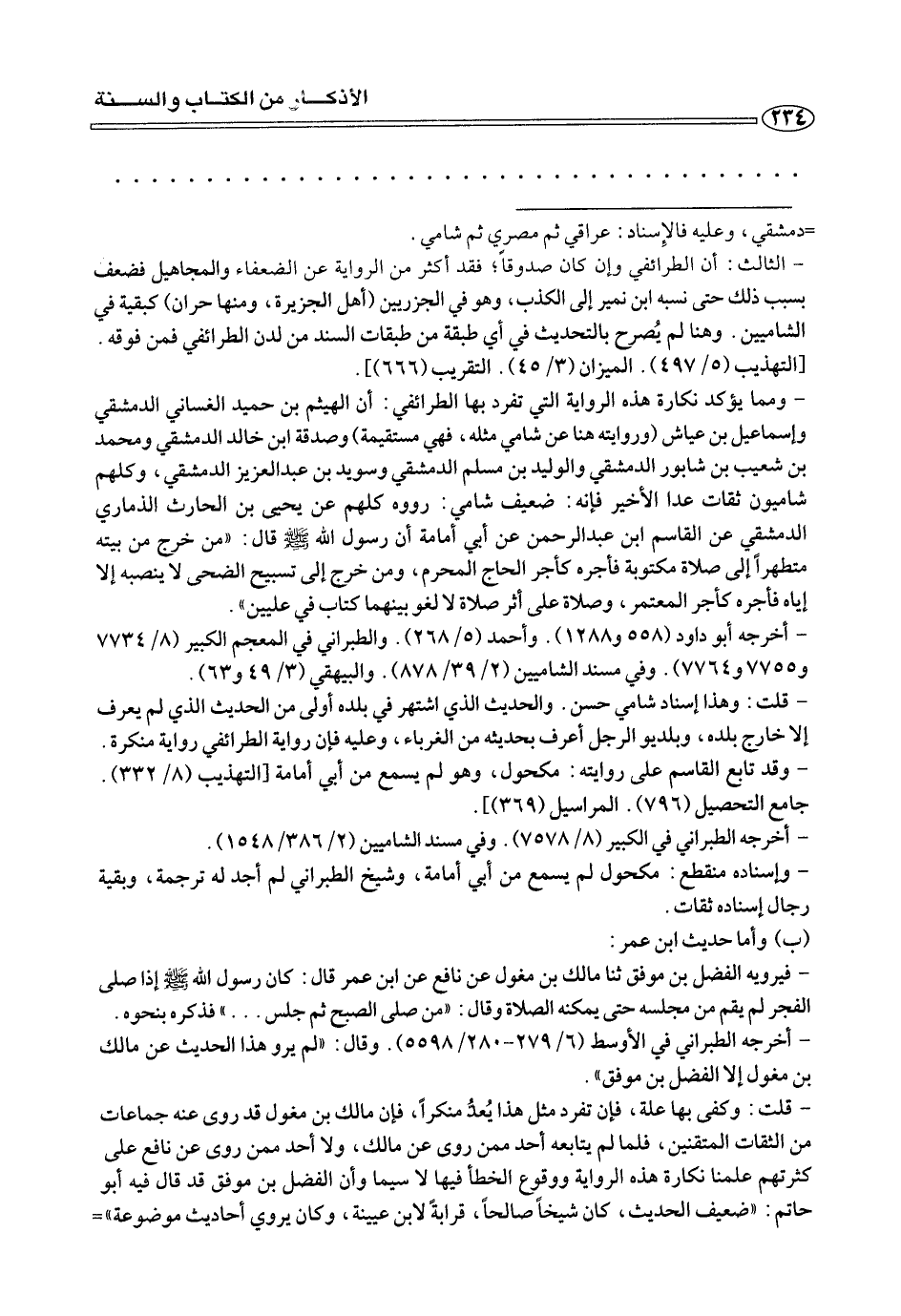 - ومما يؤكد نكارة هذه الرواية التي تفرد بها الطرائفي: أن الهيثم بن حميد الغساني الدمشقي وإسماعيل بن عياش (وروايته هنا عن شامي مثله، فهي مستقيمة) وصدقة ابن خالد الدمشقي ومحمد بن شعيب بن شابور الدمشقي والوليد بن مسلم الدمشقي وسويد بن عبد العزيز الدمشقي، وكلهم شاميون ثقات عدا الأخير فإنه: ضعيف شامي: رووه كلهم عن يحيى بن الحارث الذماري الدمشقي عن القاسم ابن عبد الرحمن عن أبي أمامة أن رسول الله صلى الله عليه وسلم قال: «من خرج من بيته متطهرًا إلى صلاة مكتوبة فأجره كأجر الحاج المحرم، ومن خرج إلى تسبيح الضحى لا ينصبه إلا إياه فأجره كأجر المعتمر، وصلاة على أثر صلاة لا لغو بينهما كتاب في عليين».