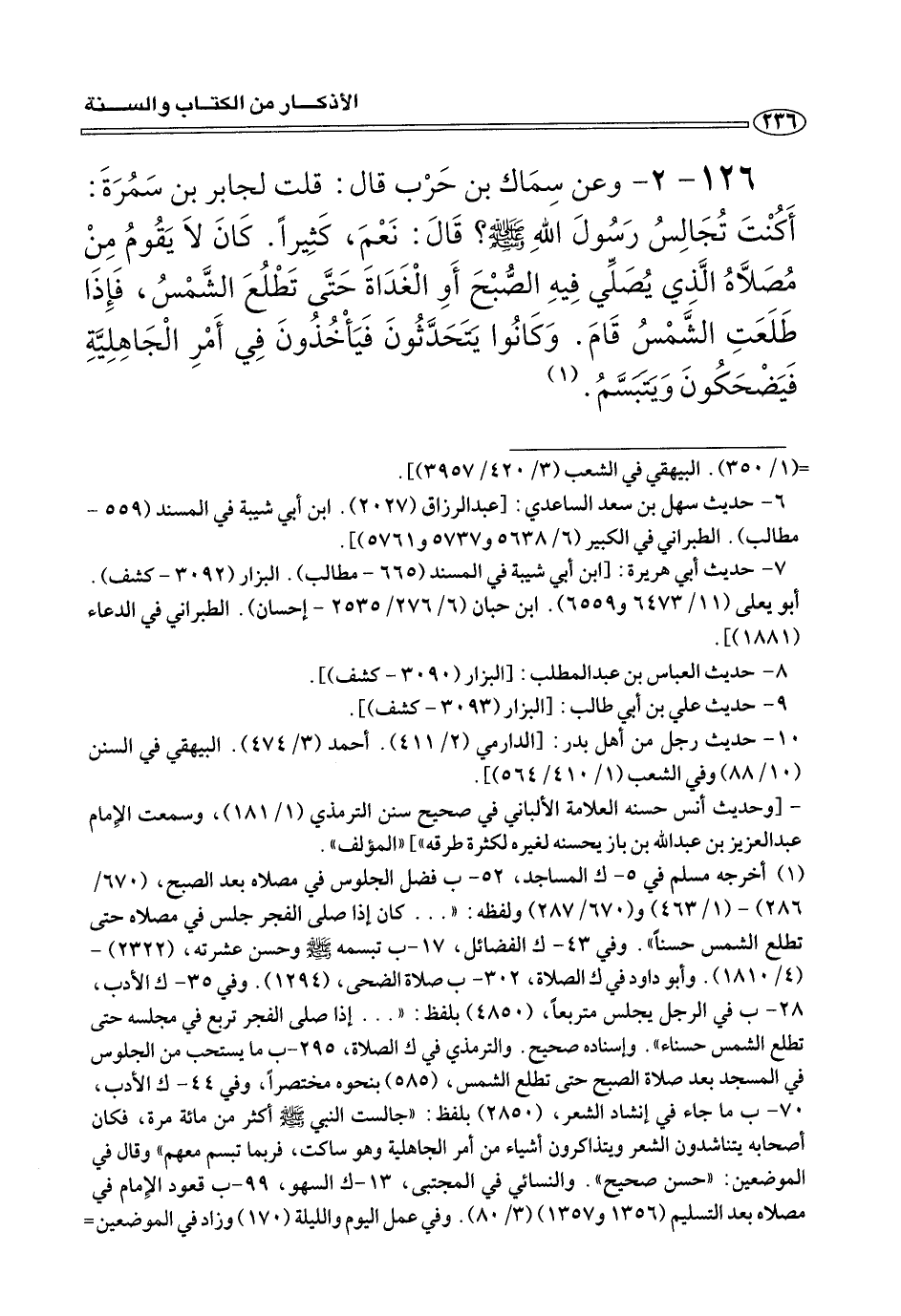 ١٢٦ - ٢ - وعن سِمَاك بن حَرْب قَالَ: قلت لجابر بن سمرة: أَكُنْتَ تُجَالِسُ رَسُولَ الله صلى الله عليه وسلم؟ قَالَ: نَعْمَ، كَثِيرًا. كَانَ لَا يَقُومُ مِنْ مُصَلَاّة الَّذِي يُصَلِّي فِيهِ الصُّبْحَ أَوِ الْغَدَاةَ حَتَّى تَطْلُعَ الشَّمْسُ، فَإِذَا طَلَعَتِ الشَّمْسُ قَامَ. وَكَانُوا يَتَحَدَّثُونَ فَيَأْخُذُونَ فِي أَمْرِ الْجَاهِلِيَّةِ فَيَضْحَكُونَ وَيَتَبَسَّمُ. (¬١)