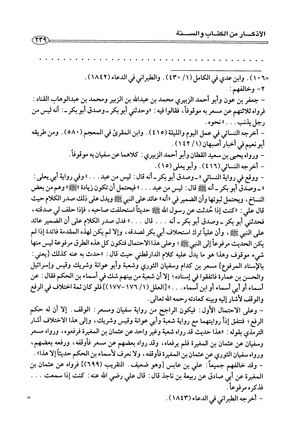 - «- وصدق أبو بكر- أنه صلى الله عليه وسلم قال: ليس من عبد ... «فيحتمل أن تكون زيادة (صللى الله عليه وسلم «وهم من بعض النساخ، ويحتمل ثبوتها وأن الضمير في «أنه «عائد على النبي صلى الله عليه وسلم ويدل على ذلك صدر الكلام حيث قال علي: (كنت إذا حُدثت عن رسول الله صلى الله عليه وسلم حديثًا استحلفت صاحبه، فإذا حلف لي صدقته، فحدثني أبو بكر- وصدق أبو بكر- أنه ... قال ... «فدل صدر الكلام على أن الضمير عائد على النبي صلى الله عليه وسلم، وأنا عليًا ترك استحلاف أبي بكر لصدقه، وإلا لم يكن لهذه المقدمة فائدة إذا للم يكن الحديث مرفوعًا إلى النبي صلى الله عليه وسلم؛ وعلى هذا الاحتمال فتكون كل هذه الطرق مرفوعة ليس منها شيء موقوف وهذا يدل عليه كلام الدار قطني حيث قال: «حدث به عنه كذلك] يعني: بالإسناد المرغوع] مسعر بن كدام وسفيان الثوري وشعبة وأبو عوانة وشريك وقيس وإسرائيل والحسن بن عمارة فاتفقوا في إسناده؛ إلا أن شعبة من بينهم في أسماء بن الحكم فقال: عن أسماء أو أبي أسماء أو ابن أسماء ... » [العلل (١/ ١٧٦ - ١٧٧)] فلو كان ثمة اختلاف في الرفع والوقف لأشار إليه وبينه كعادته رحمه الله تعالى.
