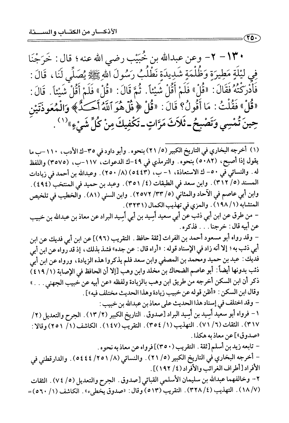 ١٣٠ - ٢ - وعن عبد الله بن خبيب رضي الله عنه؛ قَالَ: خَرَجْنَا فِي ليْلَةٍ مَطِيرَةٍ وَظُلْمَةٍ شَدِيدَةٍ نَطْلُبُ رَسُولَ اللهِ صلى الله عليه وسلم يُصَلِّي لَنَا، قَالَ: فَأَدرْكْتُهُ فَقَالَ: «قُلْ» فَلَمْ أَقُلْ شَيْئًا. ثُمَّ قَالَ: «قُلْ» فَلَمْ أَقُلْ شَيْئًا. قَالَ: «قُلْ» فَقُلْتُ: مَا أَقُولُ؟ قال: «قُلْ {قُلْ هُوَ اللهُ أَحَدٌ} وَالْمُعوِّذَتَيْنِ حِينَ تُمْسِي وَتَصْبِحُ- ثَلاثَ مَرَّاتٍ- تَكْفِيكَ مِنْ كُلِّ شَيْءٍ» (¬١) .