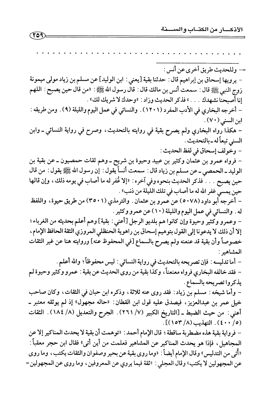 - فرواية بقية هذه مضطربة ساقطة؛ قال الإمام أحمد: «توهمت أن بقية لا يحدث المناكير إلا عن المجاهيل، فإذا هو يحدث المناكير عن المشاهير فعلمت من أين أتى «فقال ابن حجر معقبًا: «أُتي من التدليس «وقال الإمام أيضًا: «وما روى بقية عن بحير وصفوان والثقات يكتب، وما روى عن المجهولين لا يكتب «وقال العجلي: «ثقة فيما يروي عن المعروفين، وما روى عن المجهولين=