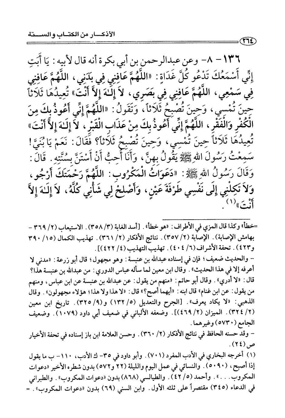 ١٣٦ - ٨ - وعن عبد الرحمن بن أبي بكرة إِنَّهُ قَالَ لأبيه: يَا أَبَتِ إِنِّي أَسْمَعُكَ تَدْعُو كُلِّ غَدَاةٍ: «اللَّهُمَّ عَافِنِي فِي بدني، اللَّهُمَّ عَافِنِي فِي سَمْعِي، اللَّهُمَّ عَافِنِي فِي بَصَرِي، لَا إله إِلَاّ أَنْتَ» تُعِيدُهَا ثَلَاثًا حِينَ تُمْسِي، وَحِينَ تُصْبِحُ ثلاثًا، وَيَقَولُ: «اللَّهُمَّ إِنِّي أَعُوذُ بِكَ مِنَ الْكُفْرِ وَالْفَقْرِ، اللَّهُمَّ إِنِّي أَعُوذُ بِكَ مِنْ عَذَابِ الْقَبْرِ، لَا إله إِلَاّ أَنْتَ» تُعِيدُهَا ثَلَاثًا حِينَ تمسي، وَحِينَ تصبح ثلاثًا؟ فَقَالَ: نَعَمْ يَا بُنَيَّ! سَمِعْتُ رَسُول الله صلى لله عليه وسيلم يَقُولُ بِهنَّ، وَأَنَا أُحِبُّ أَنْ أَسْتَنَّ بِسُنَّتِهِ. قَالَ: وَقَالَ رَسُولُ اللهِ صلى الله عليه وسلم: «دَعَوَاتُ الْمَكْرُوب: اللَّهُمَّ رَحْمَتَكَ أَرْجُو، وَلَا تَكِلْنِي إِلَى نَفْسِي طَرْفَةَ عَيْنٍ، وَأَصْلحْ لِي شَأْنِي كُلَّهُ، لَا إِلَهَ إِلَاّ أَنْتَ» (¬١) .