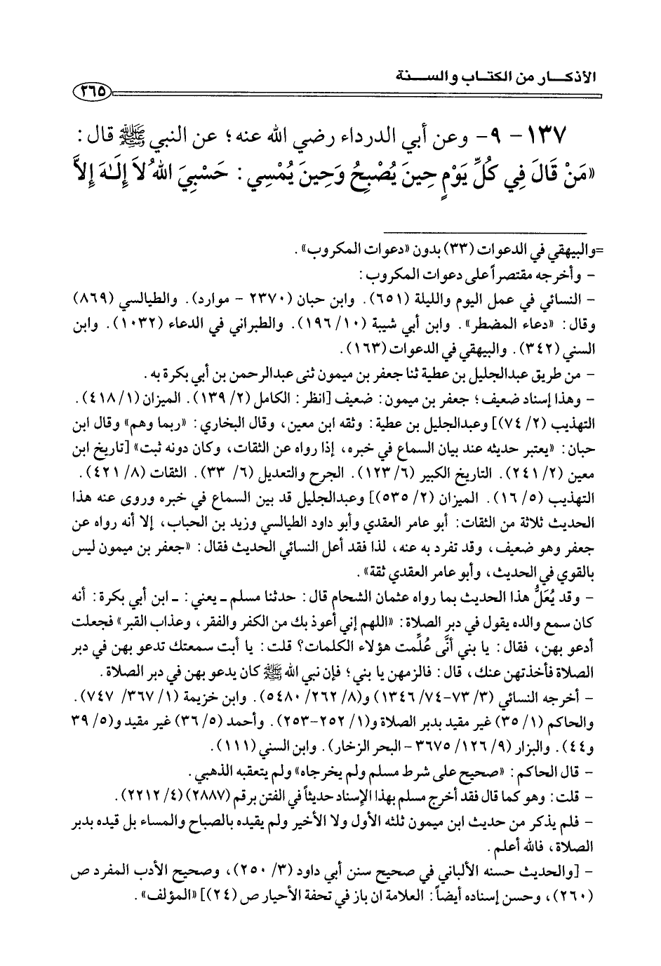 ١٣٩ - ٩ - وعن أبي الدرداء رضي الله عنه عنه؛ عَنْ النبي صلى الله عليه وسلم قَالَ: «مَنْ قَالَ فِي كُلِّ يَوْمٍ حِينَ يُصْبِحُ وَحِينَ يُمْسِي: حَسْبَيَ اللهُ لَا إِلَهَ إِلَاّ