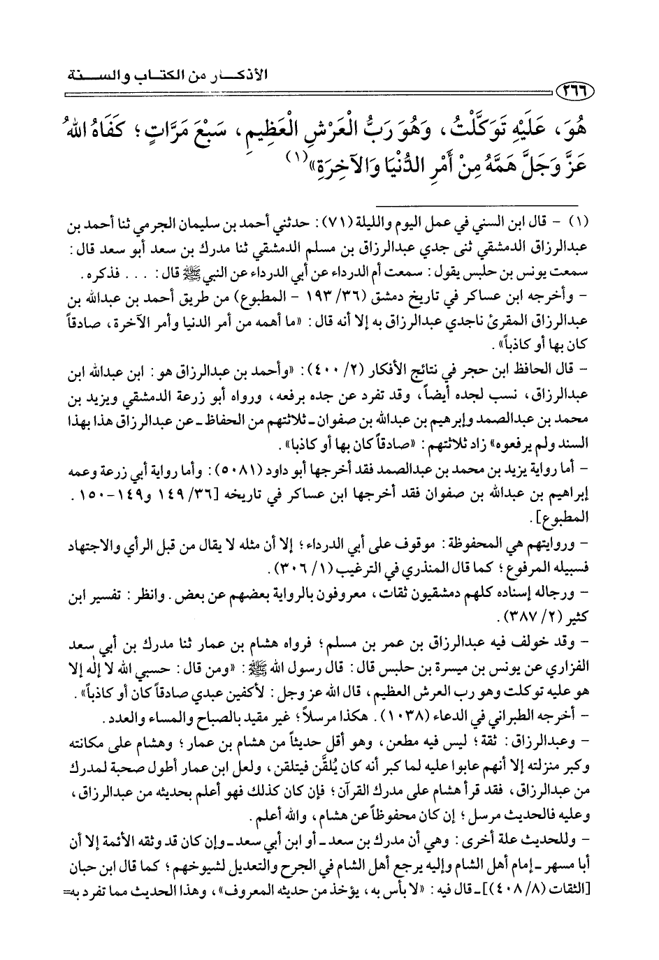 (¬١) قال ابن السني في عمل اليوم والليلة (٧١): حدثني أحمد بن سليمان الجرمي ثنا أحمد بن عبد الرزاق الدمشقي ثنى جدي عبد الرزاق بن مسلم الدمشقي ثنا مدرك بن سعد أبو سعد قال: سمعت يونس بن حلبس يقول: سمعت أم الدرداء عن النبي صلى الله عليه وسلم قال:. .. فذكره.