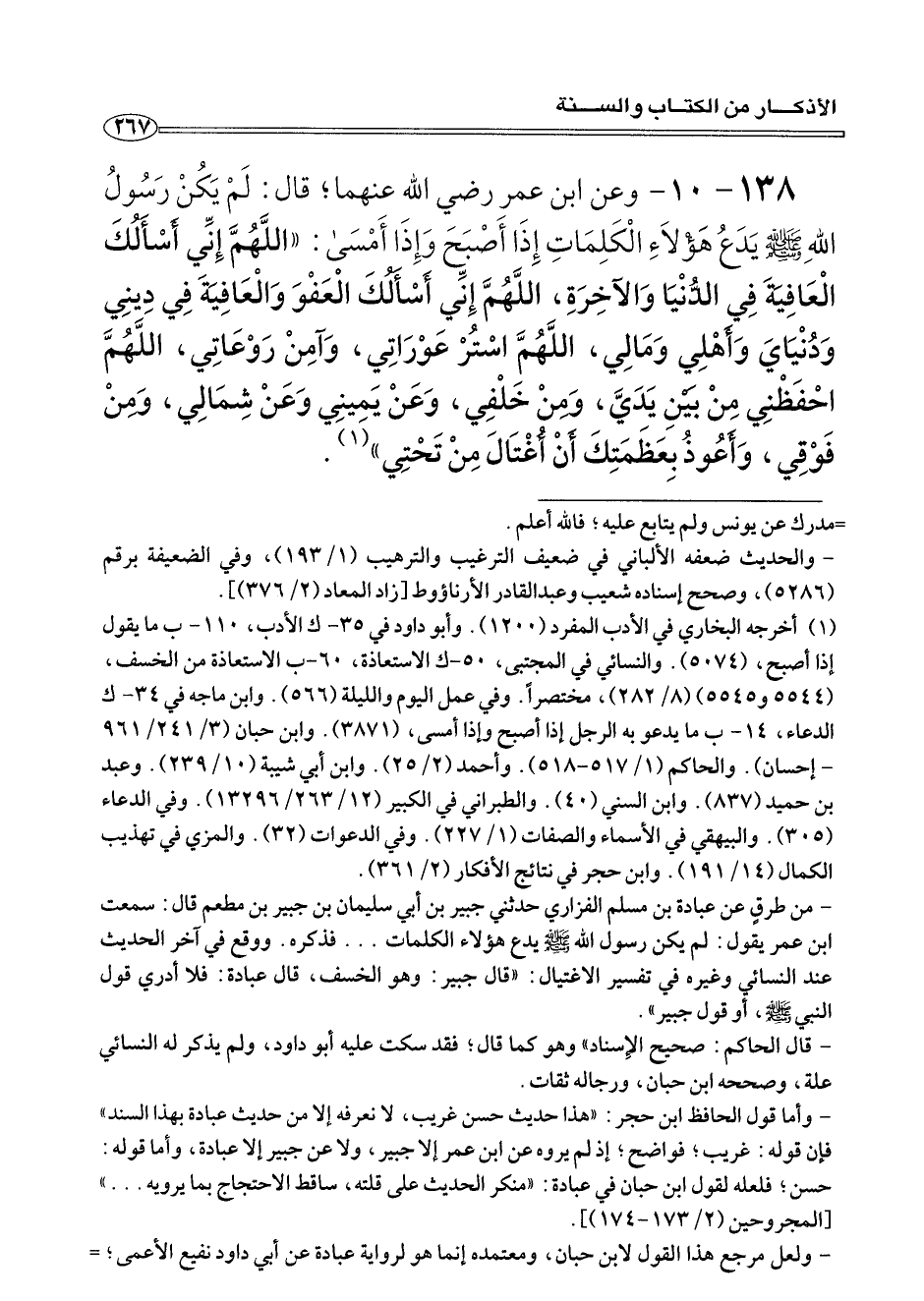 ١٣٨ - ١٠ - وعن ابن عمر رضي الله عنهما؛ قال: لَمْ يَكُنْ رَسُولُ اللهِ صلى الله عليه وسلم يَدَعُ هَؤْلَاءِ الْكَلِمَاتِ إِذَا أَصْبَحَ وَإِذَا أَمْسَى: «اللَّهُمَّ إِنِّي أَسْأَلُكَ الْعَافِيَةَ فِي الدُّنْيَا وَالآخِرَةِ اللَّهُمَّ إِنِّي أَسْأَلُكَ الْعَفْوَ وَالْعَافِيَةَ فِي دِينِي وَدُنْيَايَ وَأَهْلِي وَمَالي، اللَّهُمَّ اسْتُرْ عَوْرَاتِي، وَآمِنْ رَوْعَاتِي, اللَّهُمَّ احْفَظْنِي مِنْ بَيْنَ يَدَيَّ، وَمِنْ خَلْفِي، وَعَنْ يَمِينِي وِعَنْ شِمَالِي، وَمِنْ فَوْقِي، وَأَعُوذُ بِعَظَمَتِك أَنْ أُغْتَالَ مِنْ تَحْتِي» (¬١) .