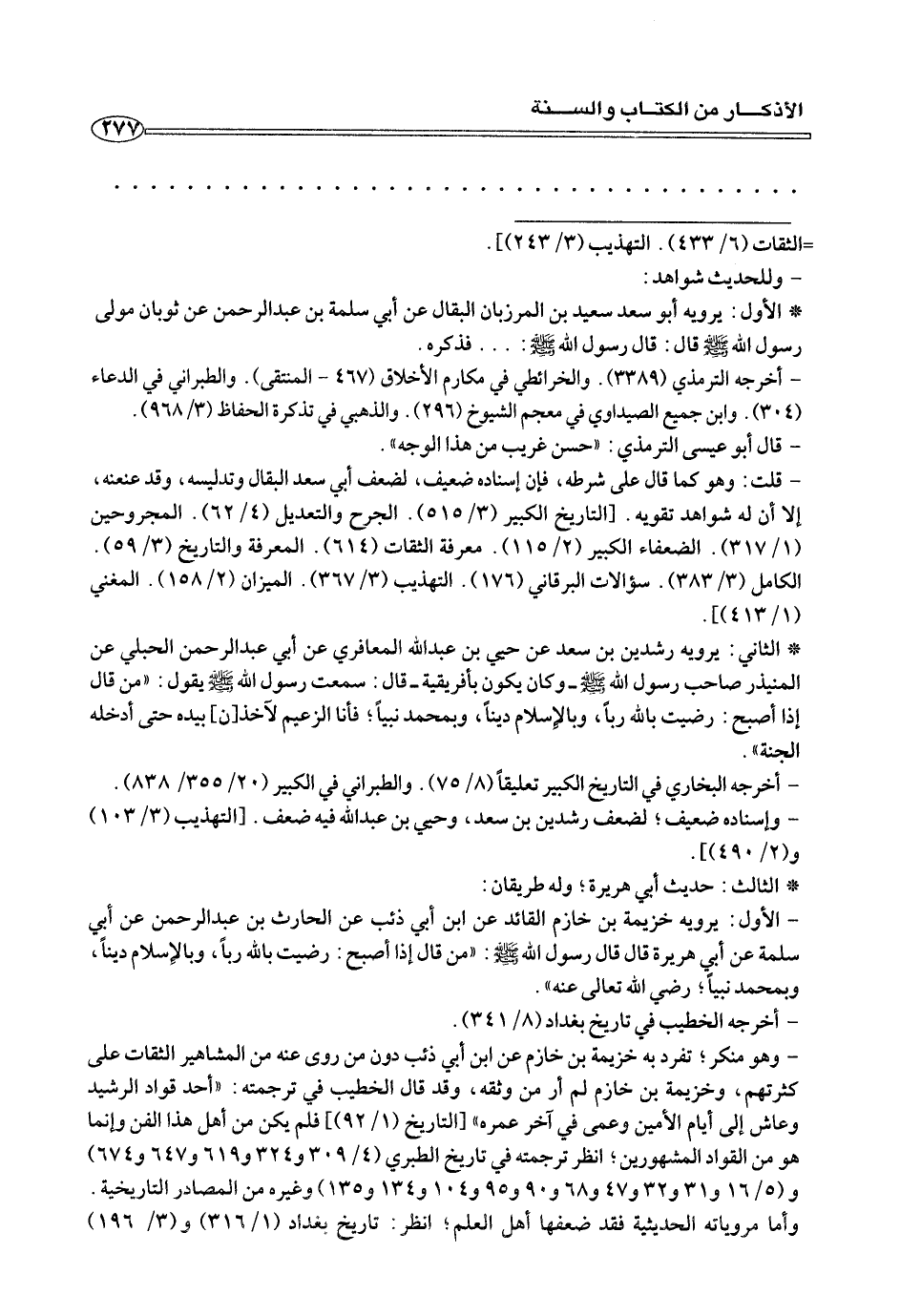 - الأول: يرويه خزيمة بن خازم القائد عن ابن أبي ذئب عن الحارث بن عبد الرحمن عن أبي سلمة عن أبي هريرة قال قال رسول الله صلى الله عليه وسلم:» من قال إذا أصبح: رضيت بالله ربًا، وبالإسلام دينًا، وبمحمد نبيًا؛ رضي الله تعالى عنه «.