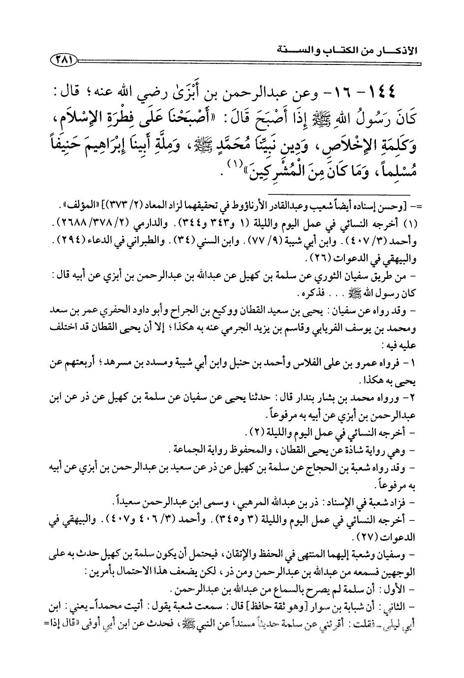 ١٤٤ - ١٦ - وعن عبد الرحمن بن أَبْزَى رضي الله عنه؛ قَالَ: كَانَ رَسُولُ اللهِ صلى الله عليه وسلم إِذَا أَصْبَحَ قَالَ: «أَصْبَحْنا عَلَى فِطرةِ الإسلامِ، وَكَلِمَةِ الإِخْلَاصِ، ودين نَبِيِّنا مُحَمَّدٍ صلى الله عليه وسلم، وَمِلَّةِ أَبِينَا إِبْرَاهِيمَ حَنِيفًا مُسْلِمًا، وَمَا كَانَ مِنَ الْمُشْرِكِينَ» (¬١) .