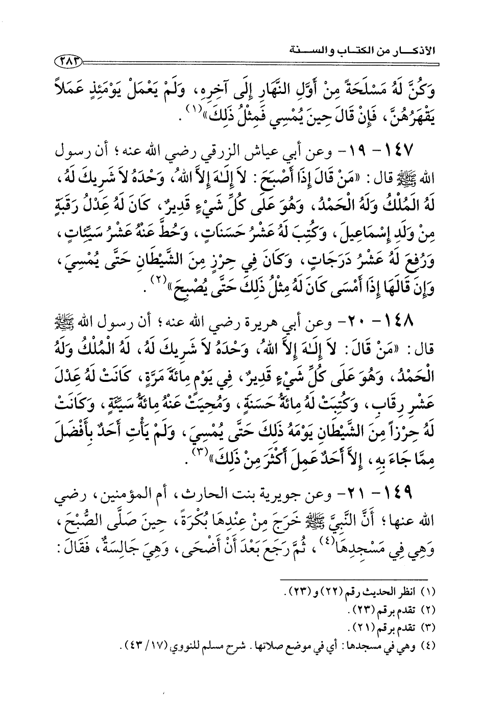 ١٤٨ - ٢٠ - عَنْ أبي أيُّوبِ قَالَ: قَالَ رسولُ اللهِ صلَّى اللهُ عليه وسلَّم: «مَن قَالَ: لَا إلهَ إِلَاّ اللهُ، وَحْدَهُ لَا شريكَ لَهُ، لَهُ الْمُلْكُ وَلَهُ الْحَمْدُ، وَهُوَ عَلَى كُلِّ شيءٍ قديرٌ، فِي يَوْمٍ مِائَةَ مَرَّةٍ، كَانَت لَهُ عَدْلَ عَشْرِ رِقَابِ، وكَتَبَت لَهُ مِائَةُ حَسَنَةٍ، وَمُحِيَتْ عَنْهُ مِائَةُ سَيِّئَةٍ، وَكَانَتْ لَهُ حِرْزًا مِنَ الشَّيْطَانِ يَوْمَهُ ذَلِكَ حَتَّى يُمْسِي، وَلَمْ يِأْتِ أَحَدٌ بِأَفْضَلَ مِمَّا جَاءَ بِهِ، إِلَاّ أَحَدٌ عَمِل أَكْثَرَ مِنْ ذَلِكَ» (¬٣)