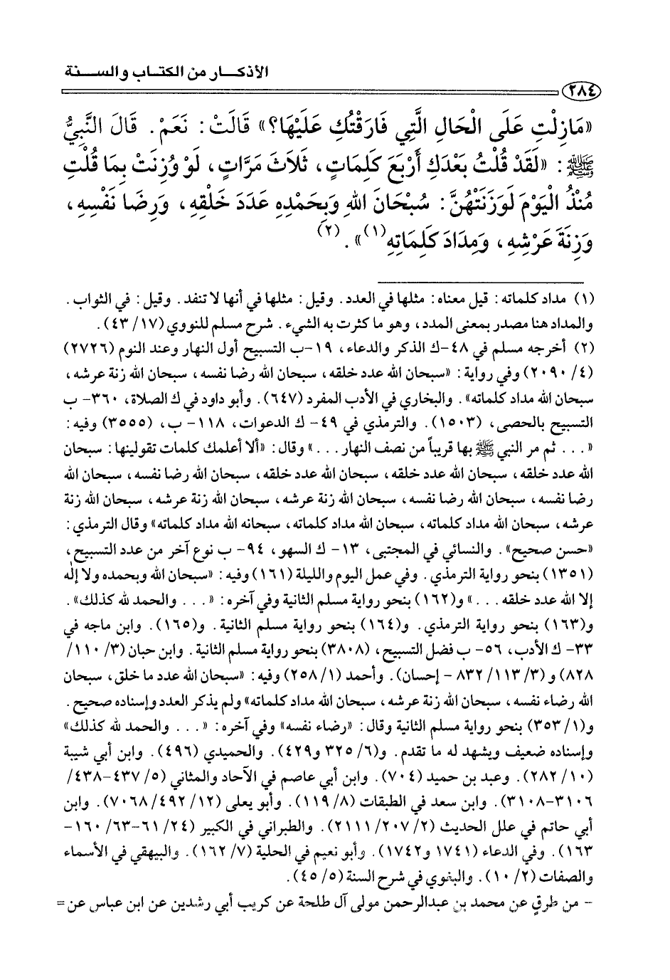(¬٢) أخرجه مسلم في ٤٨ - ك الذكر والدعاء، ١٩ - ب التسبيح أول النهار وعند النوم (٢٧٢٦) (٤/ ٢٠٩٠) وفي رواية:» سبحان الله عدد خلقه، سبحان الله رضا نفسه، سبحان الله زنة عرشه، سبحان الله مداد كلماته «. والبخاري في الأدب المفرد (٦٤٧). وأبو داود في ك الصلاة، ٣٦٠ - ب التسبيح بالحصى، (١٥٠٣). والترمذي في ٤٩ - ك الدعوات، ١١٨ - ب، (٣٥٥٥) وفيه:» ... ثم مر النبي صلى الله عليه وسلم بها قريبًا من نصف النهار .... «وقال:» ألا أعلمك كلمات تقولينها:» سبحان الله عدد خلقه، سبحان الله عدد خلقه، سبحان الله عدد خلقه، سبحان الله رضاء نفسه، سبحان الله رضاء نفسه، سبحان الله رضاء نفسه، سبحان الله زنة عرشه، سبحان الله زنة عرشه، سبحان الله زنة عرشه، سبحان الله مداد كلماته، سبحان الله مداد كلماته، سبحان الله مداد كلماته «وقال الترمذي:» حسن صحيح». والنسائي في المجتبي، ١٣ - ك السهو، ٩٤ - ب نوع آخر من عدد التسبيح، (١٣٥١) بنحو رواية الترمذي. وفي عمل اليوم والليلة (١٦١) وفيه:» سبحان الله وبحمده ولا إله إلا الله عدد خلقه ... «و (١٦٢) بنحو رواية مسلم الثانية وفي آخره:» ... والحمد لله كذلك». و (١٦٣) بنحو رواية الترمذي. و (١٦٤) بنحو رواية مسلم الثانية. و (١٦٥). ابن ماجه في ٣٣ - ك الأدب، ٥٦ - ب فضل التسبيح، (٣٨٠٨) بنحو رواية مسلم الثانية. وابن حبان (٣/ ١١٠/ ٨٢٨) و (٣/ ١١٣/ ٨٣٢ - إحسان). وأحمد (١/ ٢٥٨) وفيه:» سبحان الله عدد ما خلق، سبحان الله رضاء نفسه، سبحان الله زنة عرشه، سبحان الله مداد كلماته «ولم يذكر العدد وإسناده صحيح. و (١/ ٣٥٣) بنحو رواية مسلم الثانية وقال:» رضاء نفسه «وفي آخره:» ... والحمد لله كذلك». وإسناده ضعيف ويشهد له ما تقدم و (٦/ ٣٢٥/ ٤٢٩). والحميدي (٤٩٦). وابن أبي شيبة (١٠/ ٢٨٢). وعبد بن حميد (٧٠٤). وابن أبي عاصم في الآحاد والمثاني (٥/ ٤٣٧ - ٤٣٨/ ٣١٠٦ - ٣١٠٨). وابن سعد في الطبقات (٨/ ١١٩). وأبو يعلي (١٢/ ٤٩٢/ ٧٠٦٨). وابن أبي حاتم في علل الحديث (٢/ ٢٠٧/ ٢١١١). والطبراني في الكبير (٢٤/ ٦١ - ٦٣/ ١٦٠ - ١٦٣). وفي الدعاء (١٧٤١ و ١٧٤٢) وأبو نعيم في الحلية (٧/ ١٦٢). والبيهقي في الأسماء والصفات (٢/ ١٠). والبغوي في شرح السنة (٥/ ٤٥).
