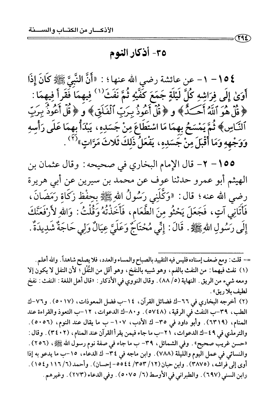 ١٥٤ - ١ - عَنْ عائشة رضي الله عنها؛ «أَنَّ النَّبِيَّ صلى الله عليه وسلم كَانَ إِذَا أَوَى إِلَى فِرَاشِةِ كُلِّ لَيْلَةٍ جَمَعَ كَفَّيْهِ ثُمَّ نَفَثَ (¬١) فِيهَا فَقَرأَ فِيهِمَا: {قل هو الله أحد} و {قل أَعُوذُ برب القلق} و {قل أَعُوذُ برب الناس} ثُمَّ يَمْسَحُ بِهِمَا مَا اسْتَطَاعَ مِنْ جَسَدِهِ، يَبْدَأُ بِهِمَا عَلَى رَأْسِهِ وَوَجْهِهِ وَمَا أَقْبِلَ مِنْ جَسَدِهِ، يَفْعَلُ ذَلِكَ ثَلَاثَ مَرَّاتٍ» (¬٢).
