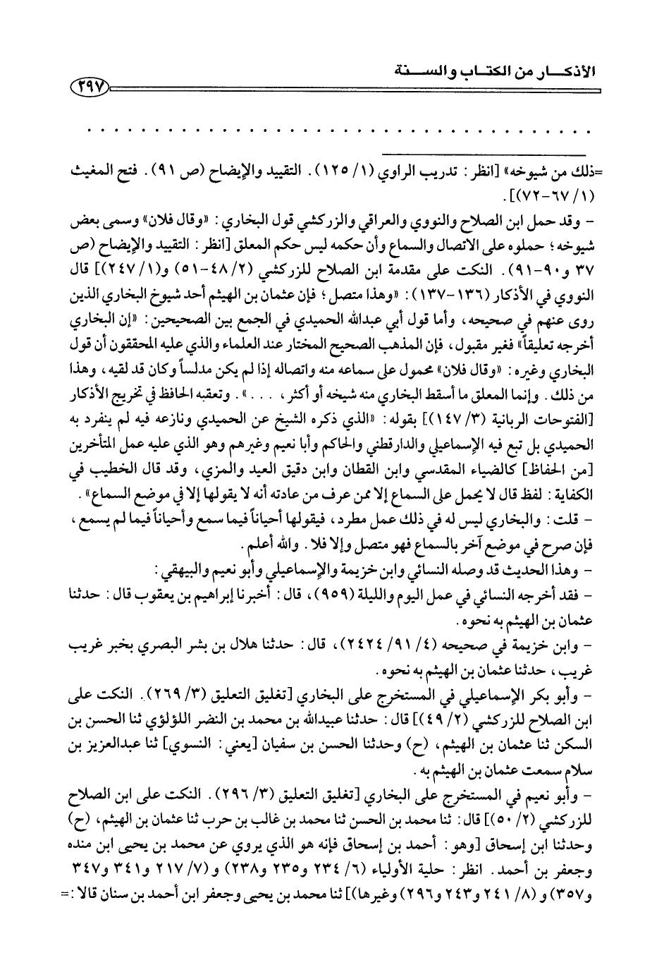 - وقد حمل ابن الصلاح والنووي والعراقي والزركشي قول البخاري:» وقال فلان» وسمى بعض شيوخه؛ حملوه على الاتصال والسماع وأن حكمه ليس حكم المعلق [انظر: التقييد والإيضاح (ص ٣٧ و ٩٠ - ٩١). النكت على مقدمة ابن الصلاح للزركشي (٢/ ٤٨ - ٥١) و (١/ ٢٤٧)] قال النووي في الأذكار (١٣٦ - ١٣٧):» وهذا متصل؛ فإن عثمان بن الهيثم أحد شيوخ البخاري الذين روى عنهم في صحيحه، وأما قول أبي عبد الله الحميدي في الجمع بين الصحيحين:» إن البخاري أخرجه تعليقا «فغير مقبول، فإن المذهب الصحيح المختار عند العلماء والذي عليه المحققون أن قول البخاري وغيره:» وقال فلان» محمول على سماعه منه واتصاله إذا لم يكن مدلسا وكان قد لقيه، وهذا من ذلك. وإنما المعلق ما أسقط البخاري منه شيخه أو أكثر، .... «وتعقبه الحافظ في تخريج الأذكار] الفتوحات الربانية (٣/ ١٤٧)] بقوله:» والذي ذكره الشيخ عن الحميدي ونازعه فيه لم ينفرد به الحميدي بل تبع فيه الإسماعيلي والدارقطني والحاكم وأبا نعيم وغيرهم وهو الذي عليه عمل المتأخرين] من الحفاظ] كالضياء المقدسي وابن القطان وابن دقيق العيد والمزي، وقد قال الخطيب في الكفاية: لفظ قال لا يحمل على السماع إلا ممن عرف من عادته أنه لا يقولها إلا في موضع السماع».