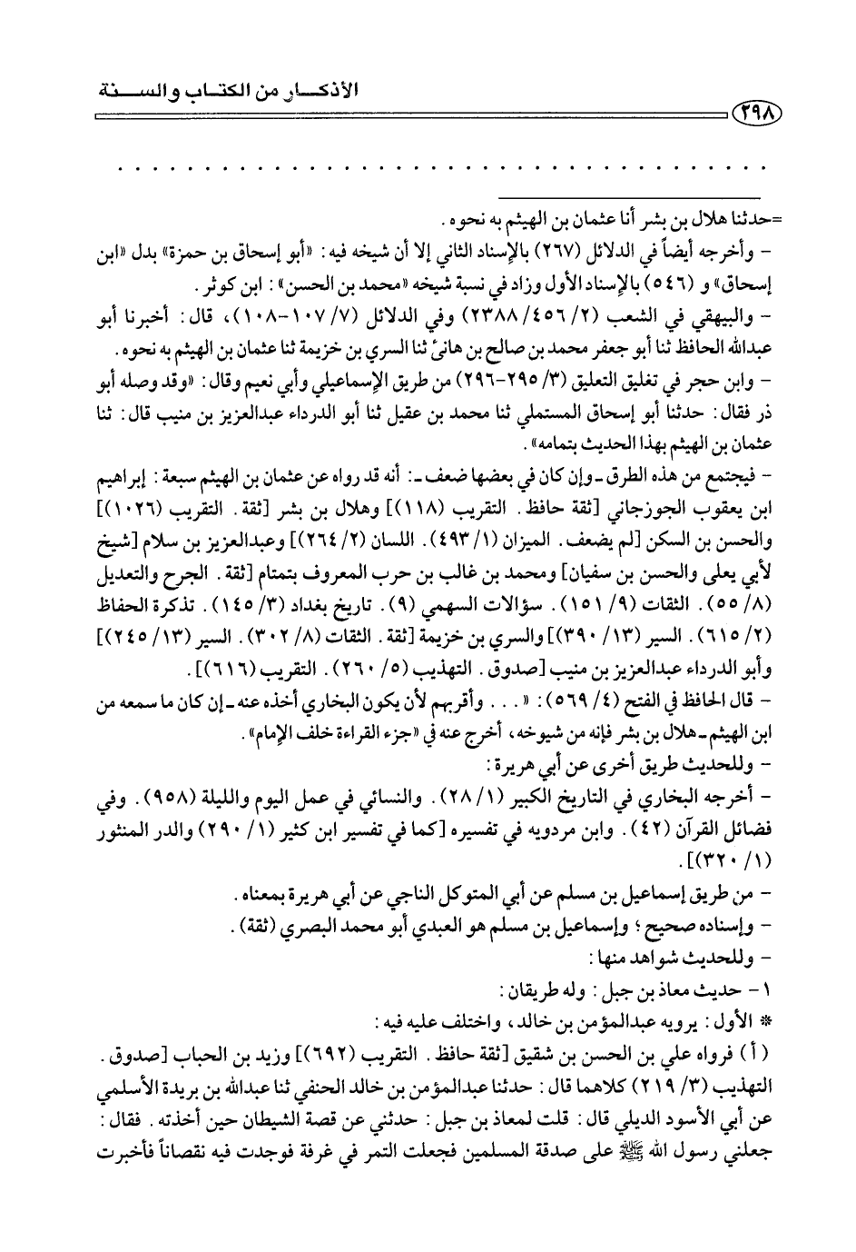 - وابن حجر في تغليق التعليق (٣/ ٢٩٥ - ٢٩٦) من طريق الإسماعيلي وأبي نعيم وقال:» وقد وصله أبو ذر فقال: حدثنا أبو إسحاق المستملي ثنا محمد بن عقيل ثنا أبو الدرداء عبد العزيز بن منيب قال: ثنا عثمان بن الهيثم بهذا الحديث بتمامه «.