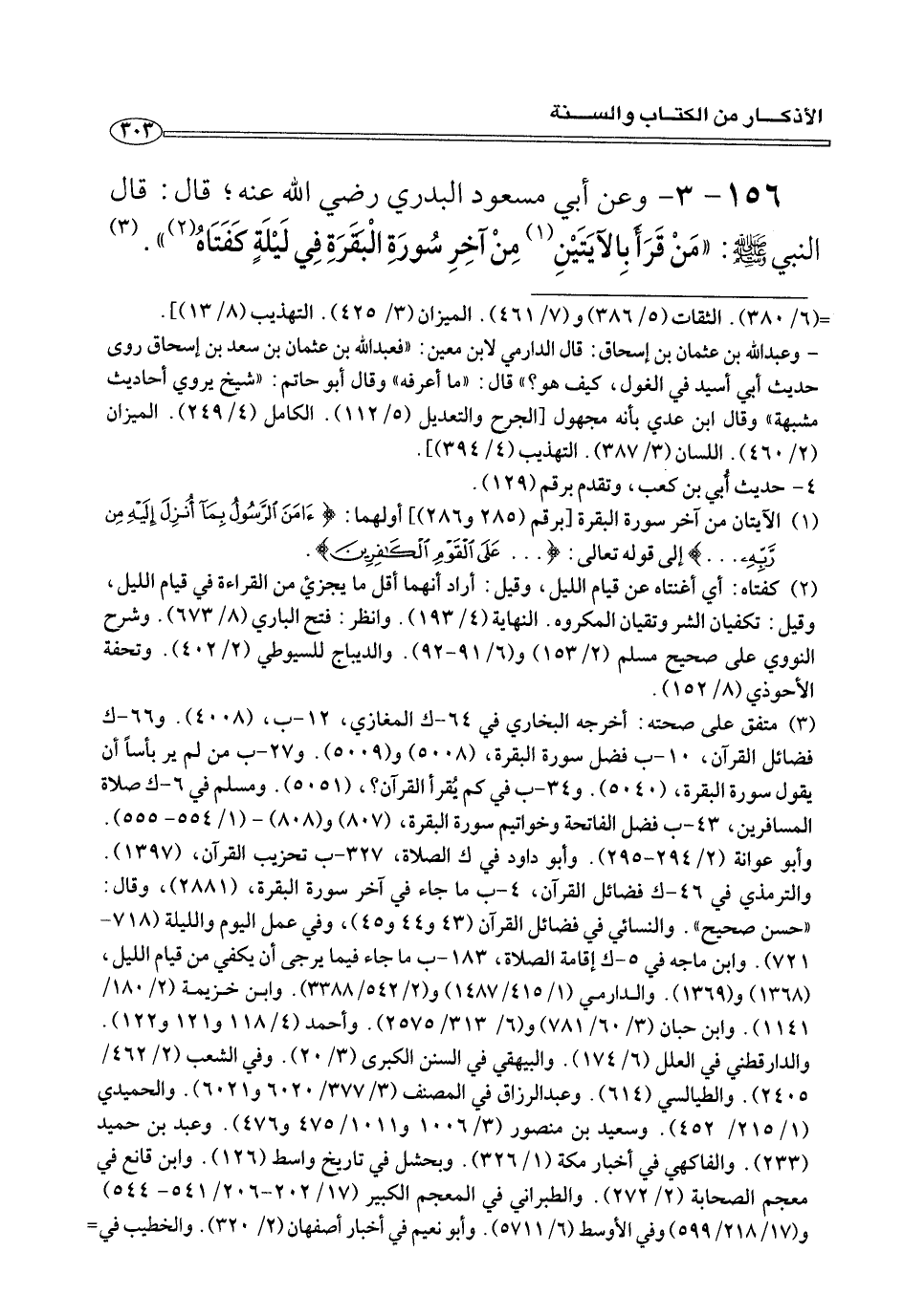 ١٥٦ - ٣ - وعن أبي مسعود البدري رضي الله عنه؛ قَالَ: قَالَ النبي صلى الله عليه وسلم: «مَنْ قَرَأَ بَالآيَتَيْنِ (¬١) مِنْ آخِرِ سُورَةِ البَقَرَةِ فِي لَيْلَةٍ كَفَتَاهُ (¬٢)» (¬٣).