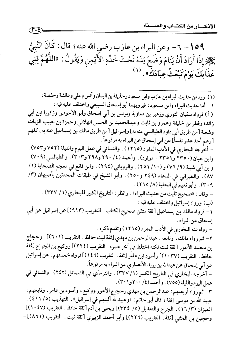 ١٥٩ - ٦ - وعن البراء بن عازب رضي الله عنه؛ قَالَ: كَانَ النَّبِيُّ صلى الله عليه وسلم إِذَا أَرَادَ أَنْ يَنَامَ وَضَعَ يَدَهُ تَحْتَ خَدِّهِ الأَيْمَنِ وَيَقُولُ: «اللَّهُمَّ قِنِي عَذَابَكَ يَوْمَ تَبْعَثُ عِبَادَكَ» (¬١) .