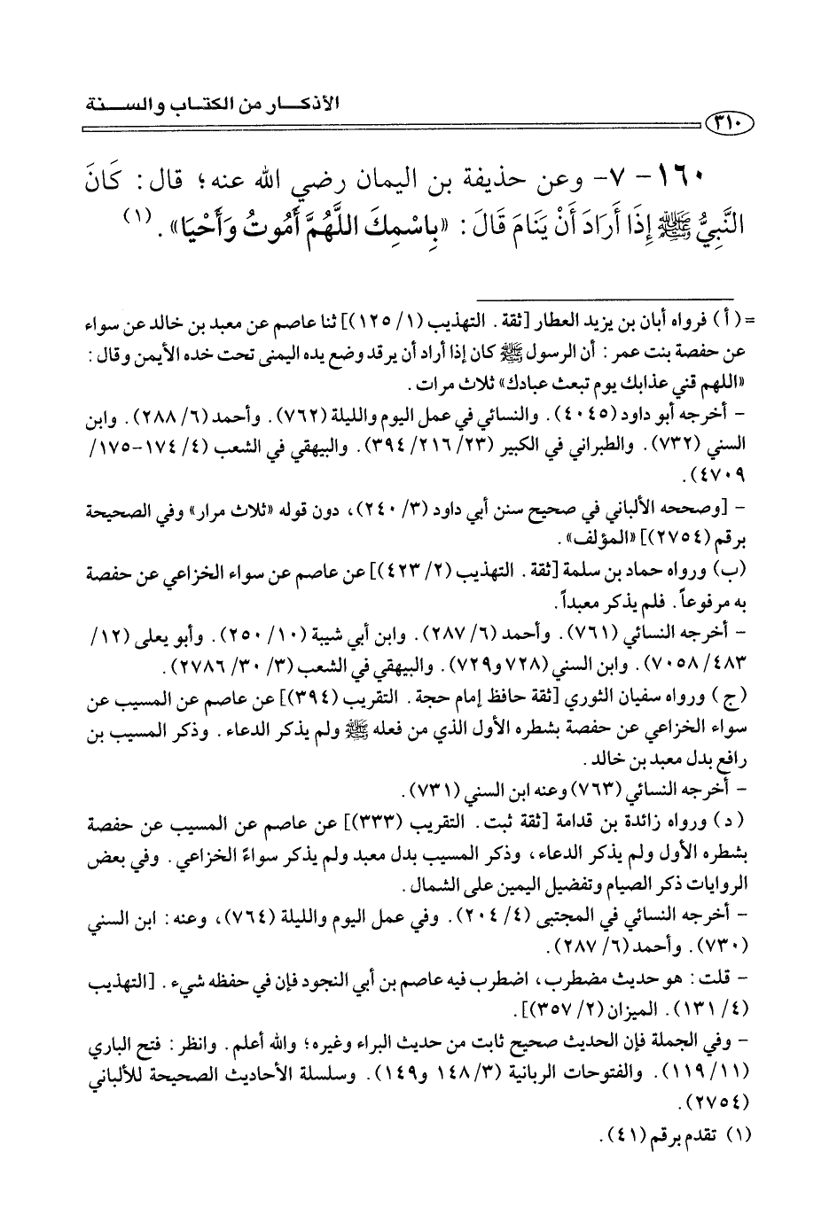 ١٦٠ - ٧ - وعن حذيفة بن اليمان رضي الله عنه؛ قَالَ: كَانَ النَّبِيُّ صلى الله عليه وسلم إِذَا أَرَادَ أَنْ يَنَامَ قَالَ: «بِاسْمِك اللَّهُمَّ أَمُوتُ وَأَحْيَا». (¬١)