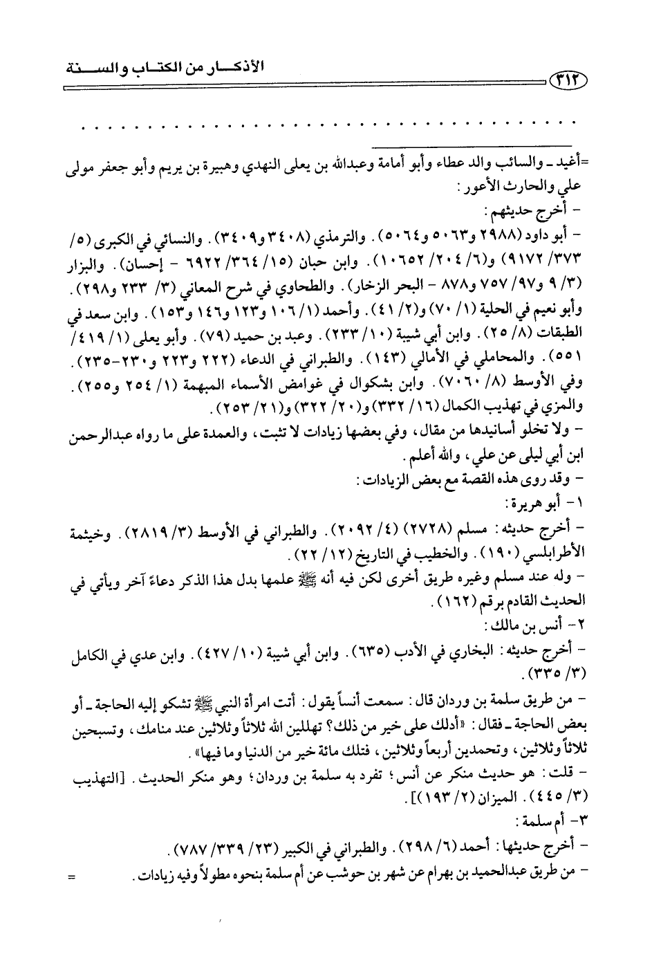 - وله عند مسلم وغيره طريق أخرى لكن فيه أنه صلى الله عليه وسلم علمها بدل هذا الذكر دعاء أخر ويأتي في الحديث القادم برقم (١٦٢).