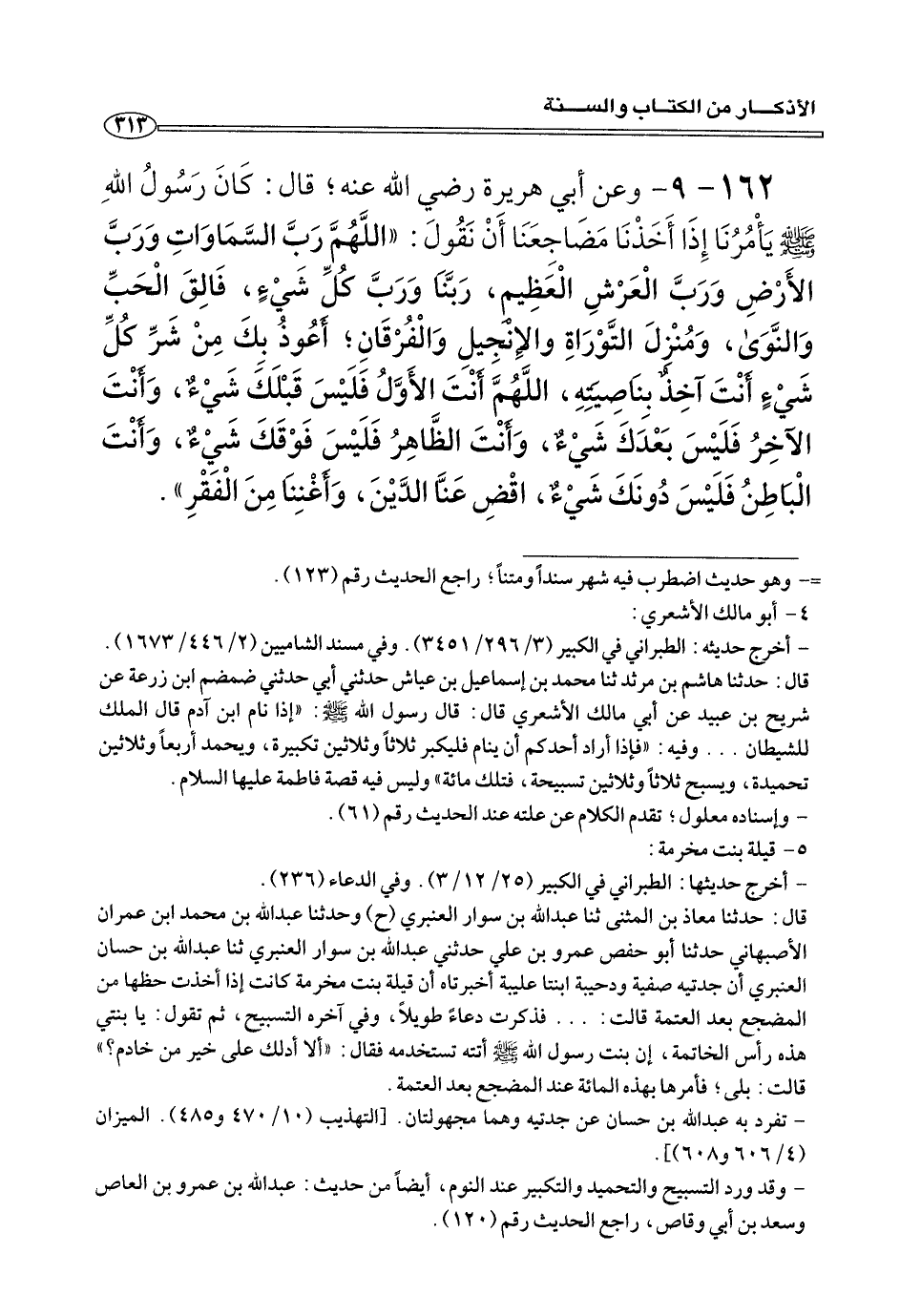 ١٦٢ - ٩ - وعن أبي هريرة رضي الله عنه؛ قَالَ: كَانَ رَسُولُ اللهِ صلى الله عليه وسلم يَأْمُرُنَا إِذَا أَخَذْنَا مَضَاجِعَنَا أَنْ نَقُولَ: «اللَّهُمَّ ربَّ السَّمَاوَاتِ وَرَبَّ الأَرْضِ وَرَبَّ الْعَرْشِ الْعَظِيمِ، رَبَّنَا وَرَبَّ كُلِّ شَيْءٍ، فَالِقَ الْحَبِّ وَالنَّوَى، وَمُنْزِلَ التَّوراةِ والإنجيلِ وَالْفُرْقَانِ؛ أَعُوذُ بِكَ مِنْ شَرِّ كُلِّ شيءٍ أَنْتَ آخِذٌ بِنَاصِيَتِهِ، اللَّهُمَّ أَنْتَ الأوَّلُ فَلَيْسَ قَبْلَكَ شَيْءٌ، وَأَنْتَ الآخِرُ فَلَيْسَ بَعْدَكَ شَيْءٌ، وَأَنْتَ الظَّاهِرُ فَلَيْسَ فَوْقَكَ شَيْءٌ، وَأَنْتَ الْبَاطِنُ فَلَيْسَ دُونَكَ شَيْءٌ، اقْضِ عنِّا الدَّيْنَ، وأَغْنِنَا مِنَ الْفَقْرِ».