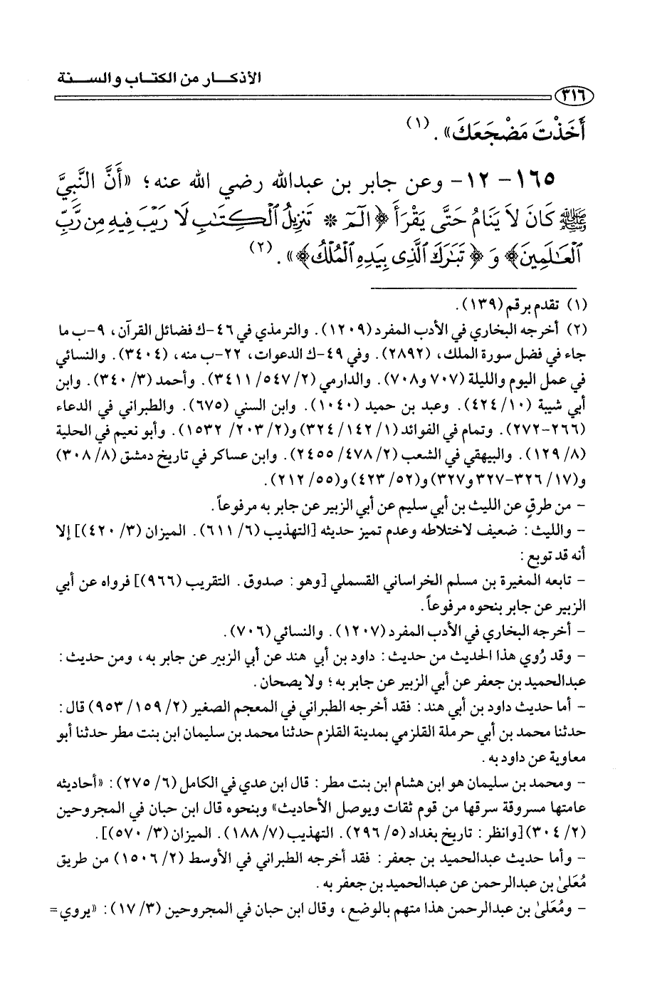 ١٦٥ - ١٢ - وعن جابر بن عبد الله رضي الله؛ «أَنَّ النَّبِيَّ صلى الله عليه وسلم كَانَ لَا يَنَامُ حَتَّى يَقْرَأَ {آلم* تنزيل الكتب لَا ريب فِيهِ من رب العلمين} و {تبرك الَّذِي بيده الملك}». (¬٢)