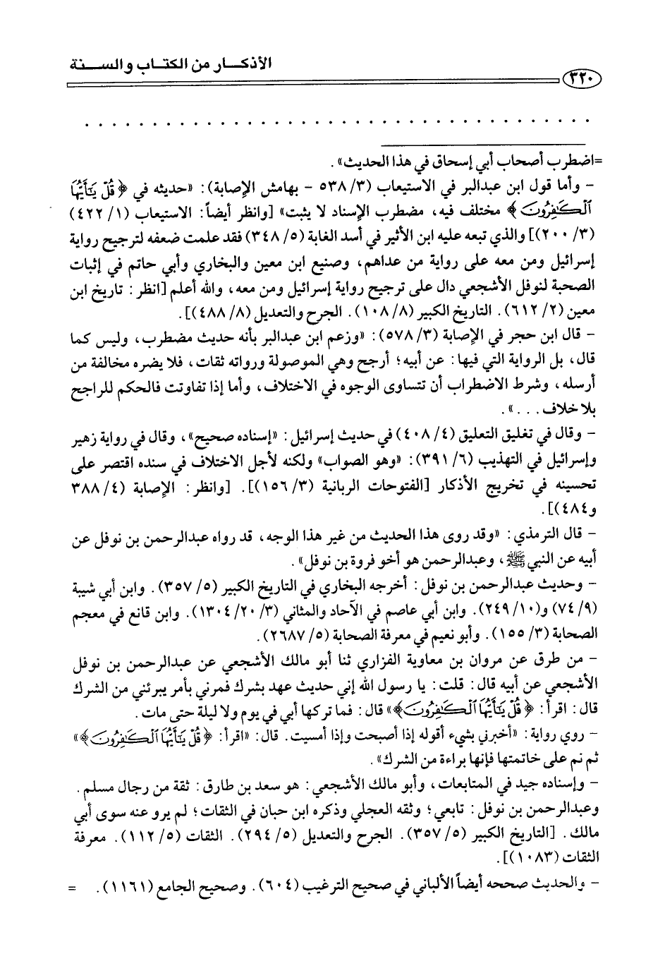 - وأما قول ابن عبد البر في الاستيعاب (٣/ ٥٣٨ - بهامش الإصابة): «حديثه في {قُلْ يَا أَيُّهَا الْكَافِرُونَ} مختلف فيه، مضطرب الإسناد لا يثبت» [وانظر أيضا: الاستيعاب (١/ ٤٢٢) (٣/ ٢٠٠)] والذي تبعه عليه ابن الأثير في أسد الغابة (٥/ ٢٤٨) فقد علمت ضعفه لترجيح رواية إسرائيل ومن معه على رواية من عداهم، ـ وصنيع ابن معين والبخاري وأبي حاتم في إثبات الصحبة لنوفل الأشجعي دال عل ترجيح رواية إسرائيل ومن معه، والله أعلم [انظر: تارخ ابن معين (٢/ ٢٠١٦). التاريخ الكبير (٨/ ١٠٨). الجرح والتعديل (٨/ ٤٨٨)].