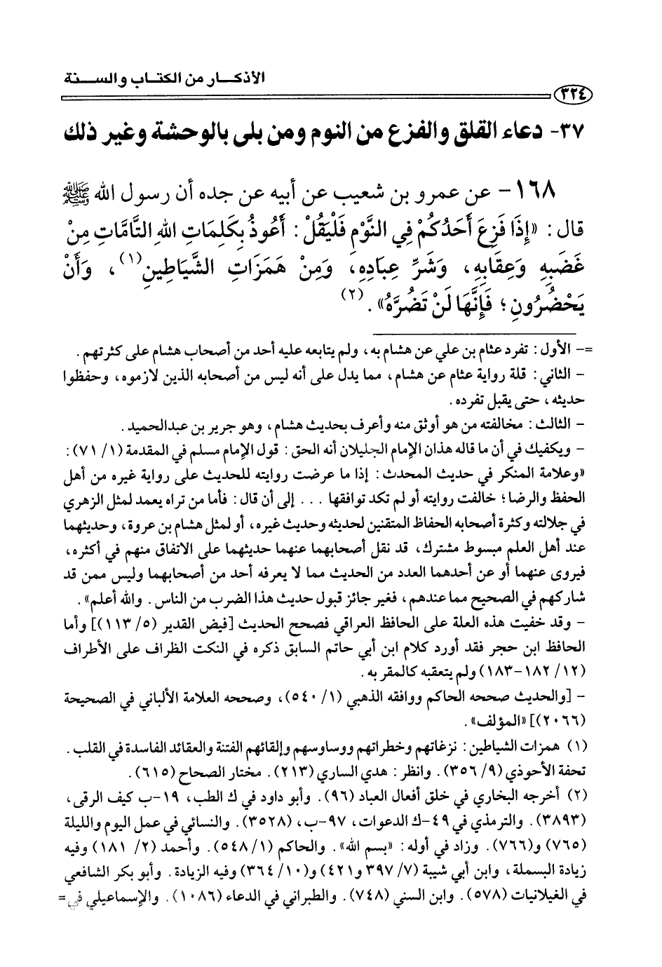 ١٦٨ - عَنْ عمرو بن شعيب عَنْ أبيه عَنْ جده أن رسول الله صلى الله عليه وسلم قَالَ: «إِذَا فَزِعَ أَحَدُكُمْ فِي النَّوْمِ فَلْيَقُلْ: أَعُوذُ بِكَلِمَاتِ اللهِ التَّامَّاتِ مِنْ غَضَبِهِ وَعِقَابِهِ، وَشَرَّ عِبَادِهِ، وَمِنْ هَمَزَاتِ الشَّيَاطِينِ (¬١)، وَأَنْ يَحْضُرُونِ؛ فَإِنَّهَا لَنْ تَضُرَّهُ». (¬٢)