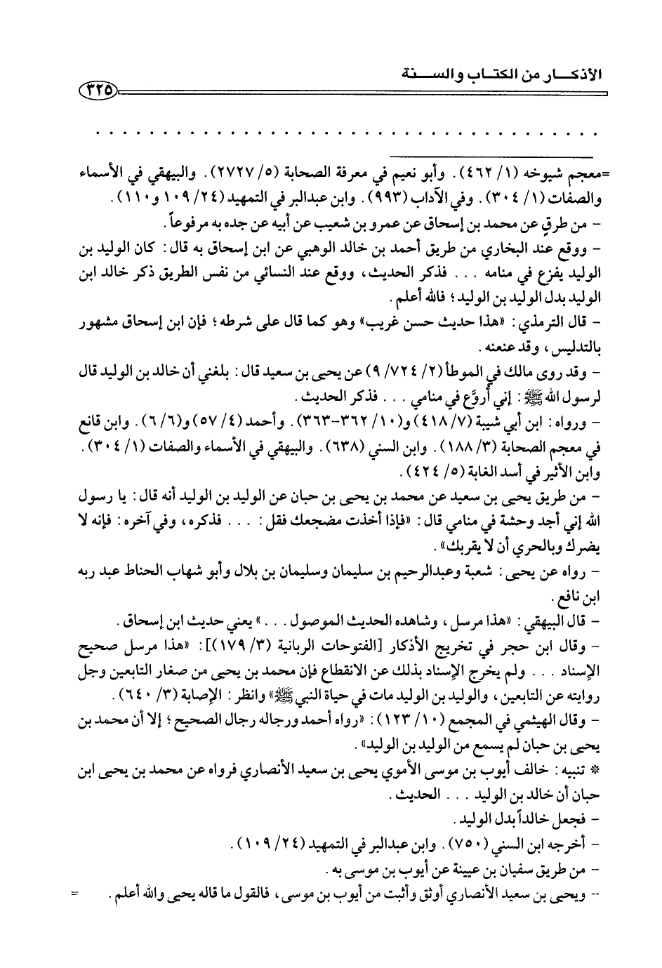 - من طريق يحيى بن سعيد عن محمد بن يحيى بن حبان عن الوليد بن الوليد أنه قال: يا رسول الله إني أجد وحشة في منامي قال: «فإذا أخذت مضجعك فقل: .. فذكره، وفي آخره: فإنه لا يضرك وبالحرى أن لا يقربك».