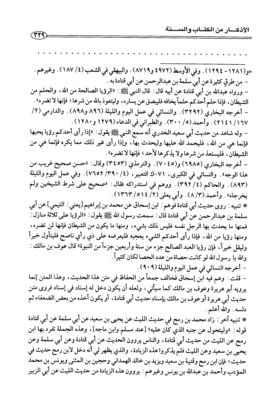 *تنبيه: روى حديث أبي قتادة فوهم: ابن إسحاق عن محمد بن إبراهيم] يعني: التيمي] عن أبي سلمة بن عبد الرحمن عن أبي قتادة قال: سمعت رسول الله صلى الله عليه وسلم يقول: «الرؤيا على ثلاثة منازل: فمنها ما يحدث بها الرجل نفسه فليس ذلك بشيء، ومنها ما يكون من الشيطان فإنها لن تضره، ومنها رؤيا من الله، فإذا رأى أحدكم الشيء يعجبه فليعرضه على ذي رأي ناصح فليتأول خيرا وليقل خيرا، فإن رؤيا العبد الصالح جزء من ستة وأربعين جزءا من النبوة «قال عوف بن مالك: والله يا رسول ا لله لو كانت حصاة من عدد الحصا لكان كثيرا.
