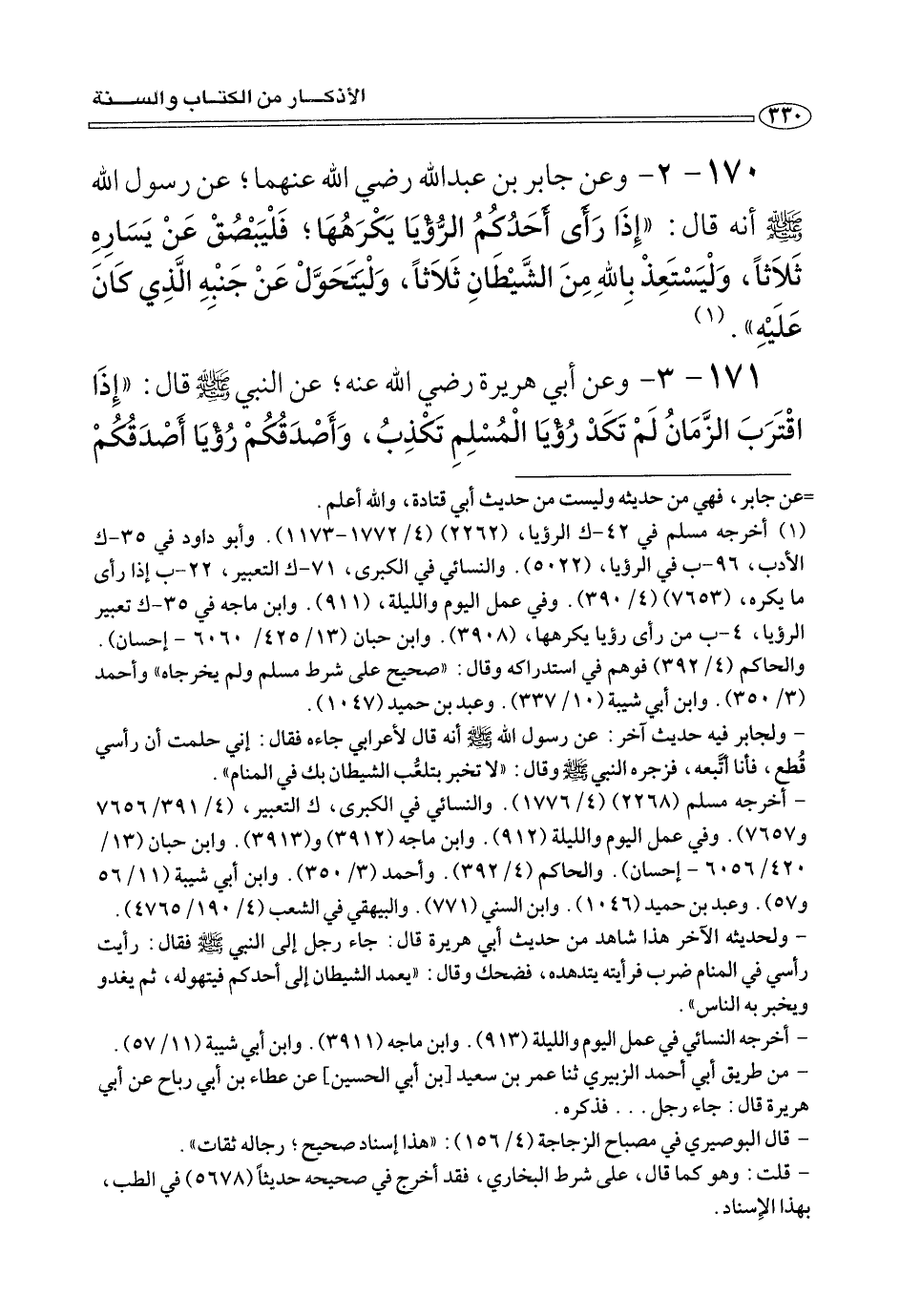 ١٧٠ - ٢ - وعن جابر بن عبد الله رضي الله عنهما؛ عَنْ رسول الله صلى الله عليه وسلم أنَّهُ قَالَ: «إِذَا رَأَى أَحَدُكُمُ الرُّؤْيَا يَكْرَهُهَا؛ فَلْيَبْصُقْ عَنْ يَسَارِهِ ثَلَاثًا، وَلْيَسْتَعِذْ بِاللهِ مِنَ الشَّيْطَانِ ثَلَاثًا، وَلْيَتَحَوَّلْ عَنْ جَنْبِهِ الَّذِي كَانَ عَلَيْهِ». (¬١)