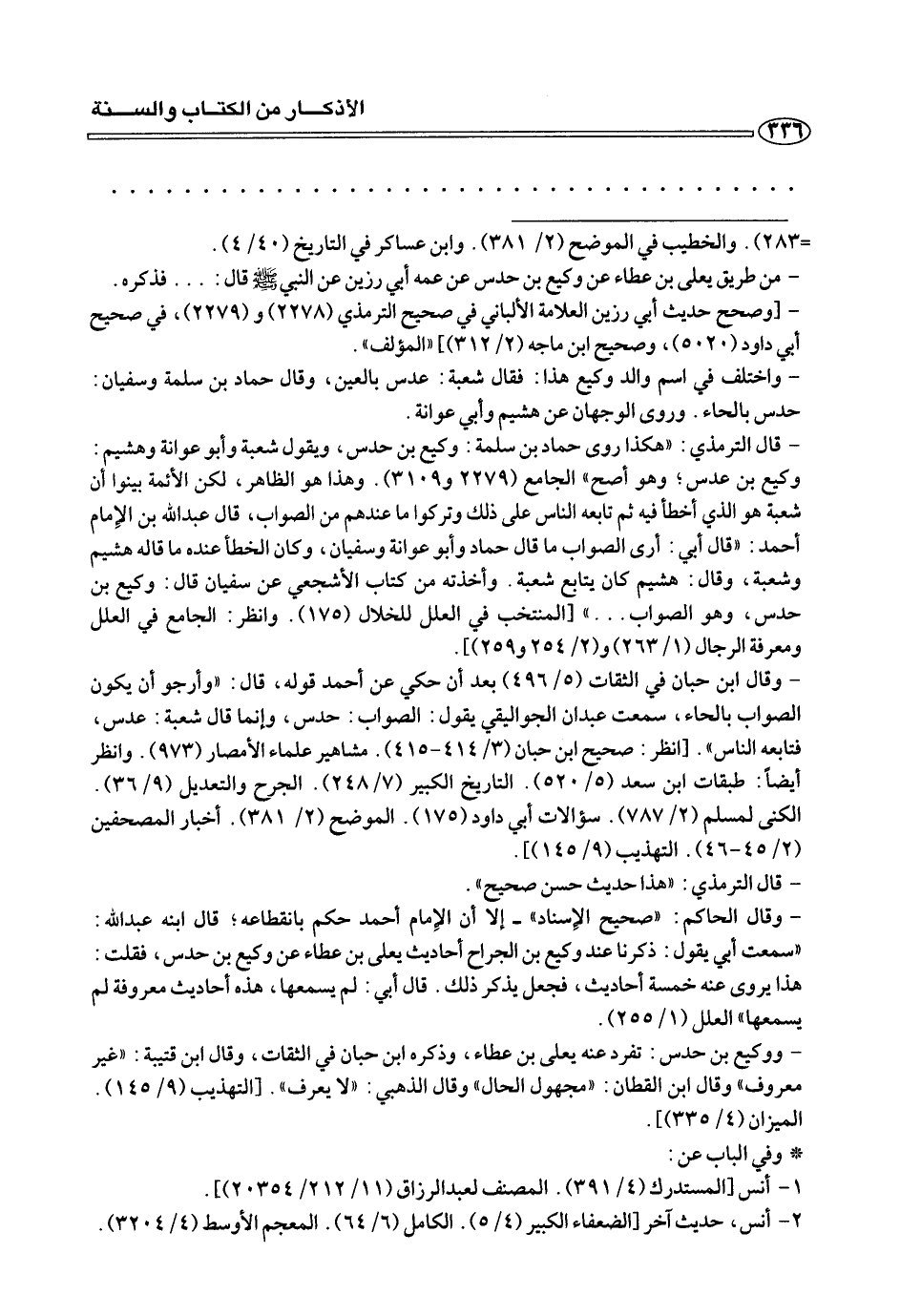 - قال الترمذي: «هكذا روى حماد بن سلمة: وكيع بن حدث، ويقول شعبة وأبو عوانة وهشيهم: وكيع بن عدس؛ وهو أصح «الجامع (٢٢٧٩ و ٣١٠٩). وهذا هو الظاهر، لكن الأئمة بينوا أن شعبة هو الذي أخطأ فيه ثم تابعه الناس على ذلك وتركوا ما عندهم من الصواب، قال عبد الله بن الإمام أحمد: «قال أبي: هأرى الصواب ما قال حماد وأبو عوانة وسفيان، وكان الخطأ عنده ما قاله هشيهم وشعبة، وقال: هشيم كان يتابع شعبة. وأخذته من كتاب الأشجعي عن سفيان قال: وكيع بن حدس، وهو الصواب ... » [المنتخب في العلل للخلال (١٧٥). انظر: الجامع في العلل ومعرفة الرجال (١/ ٢٦٣) و (٢/ ٢٥٤ و ٢٥٩)].