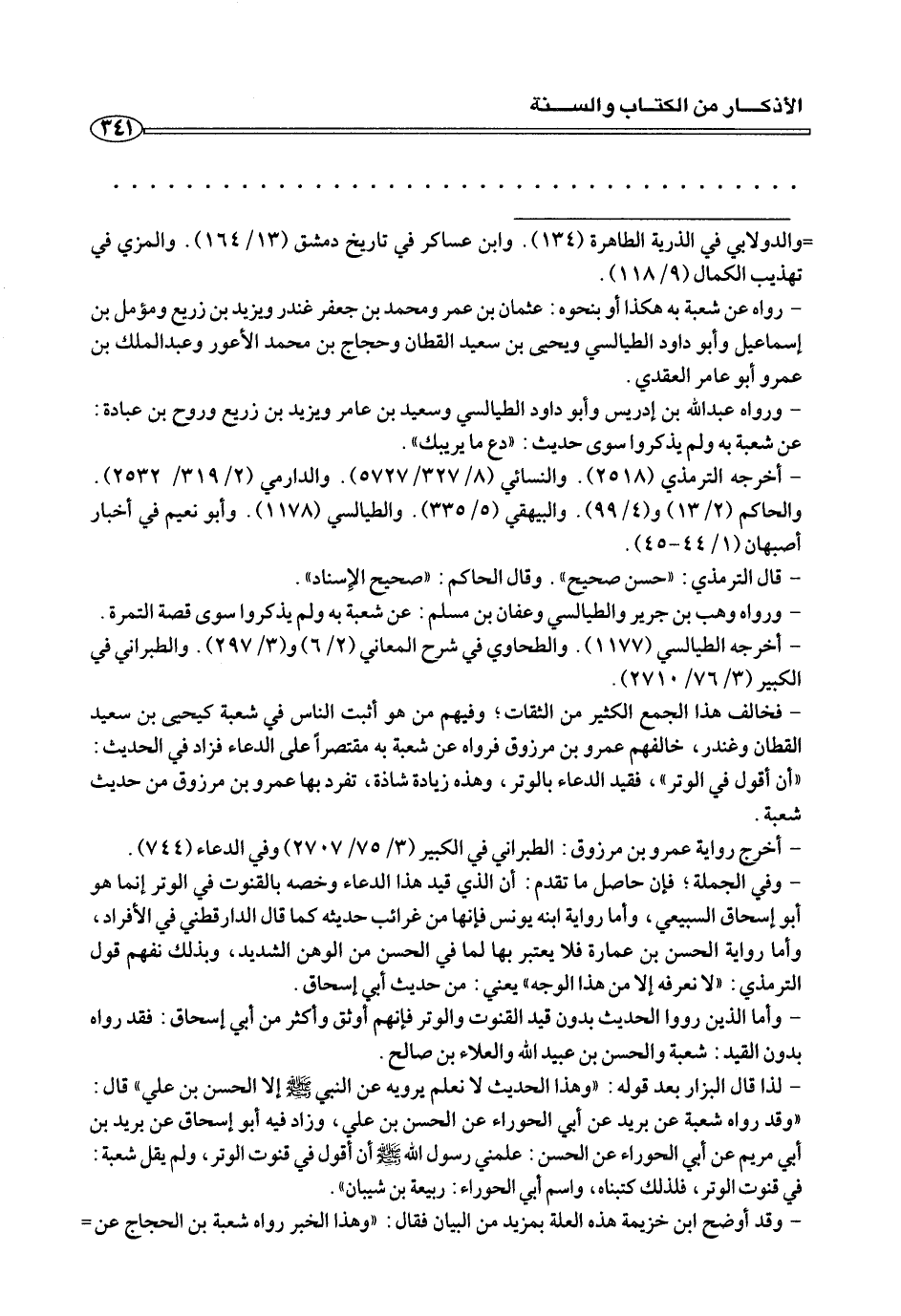 - وأما الذين رووا الحديث بدون قيد القنوت والوتر فإنهم أوثق وأكثر من أبي إسحاق: فقد رواه بدون القيد: شعبة والحسن بن عبد الله والعلاء بن صالح.