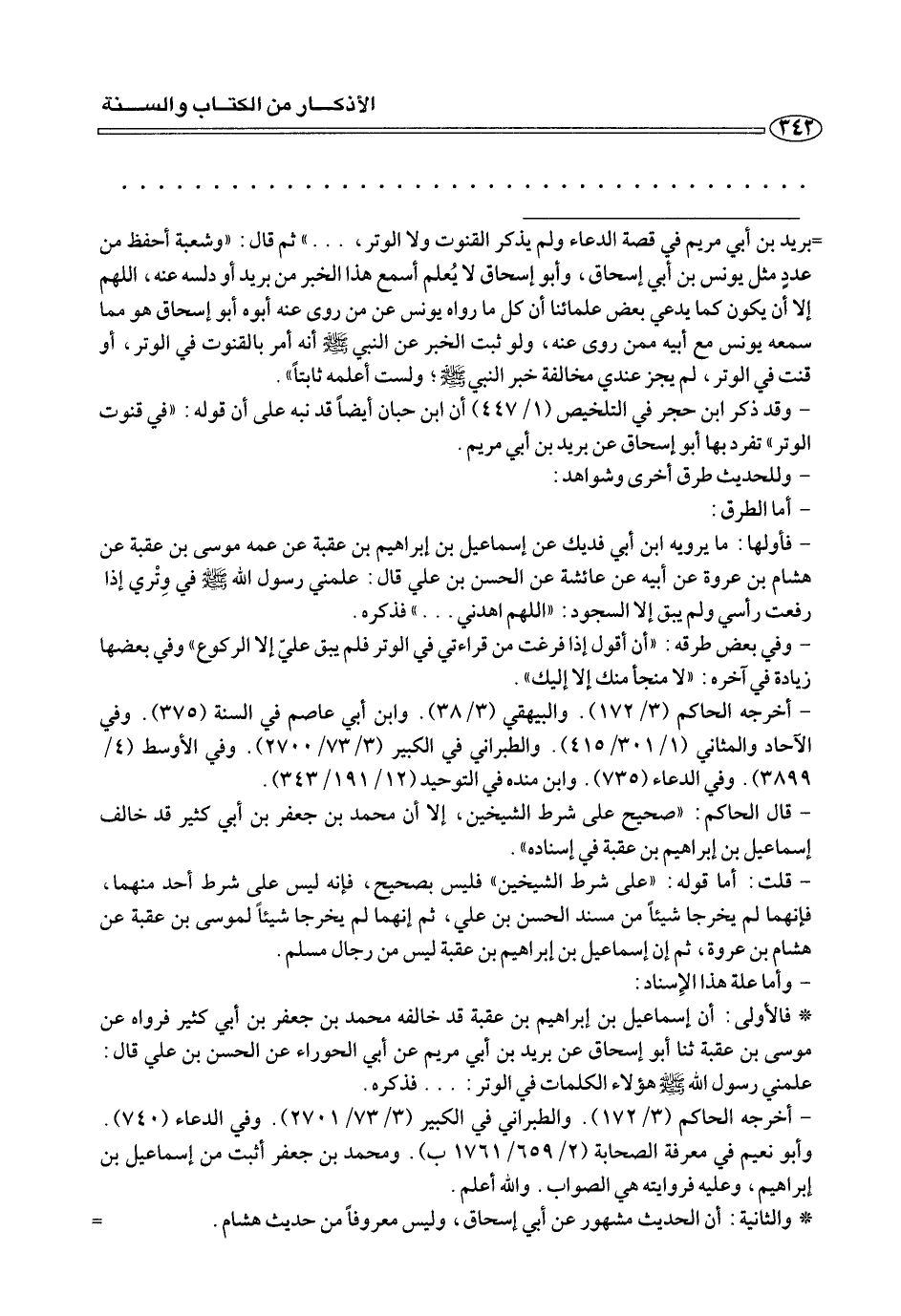 - وقد ذكر بن حجر في التلخيص (١/ ٤٤٧) أن ابن حبان أيضا قد نبه على أن قوله: «في قنوت الوتر» تفرد بها أبو إسحاق عن بريد بن أبي مريم.