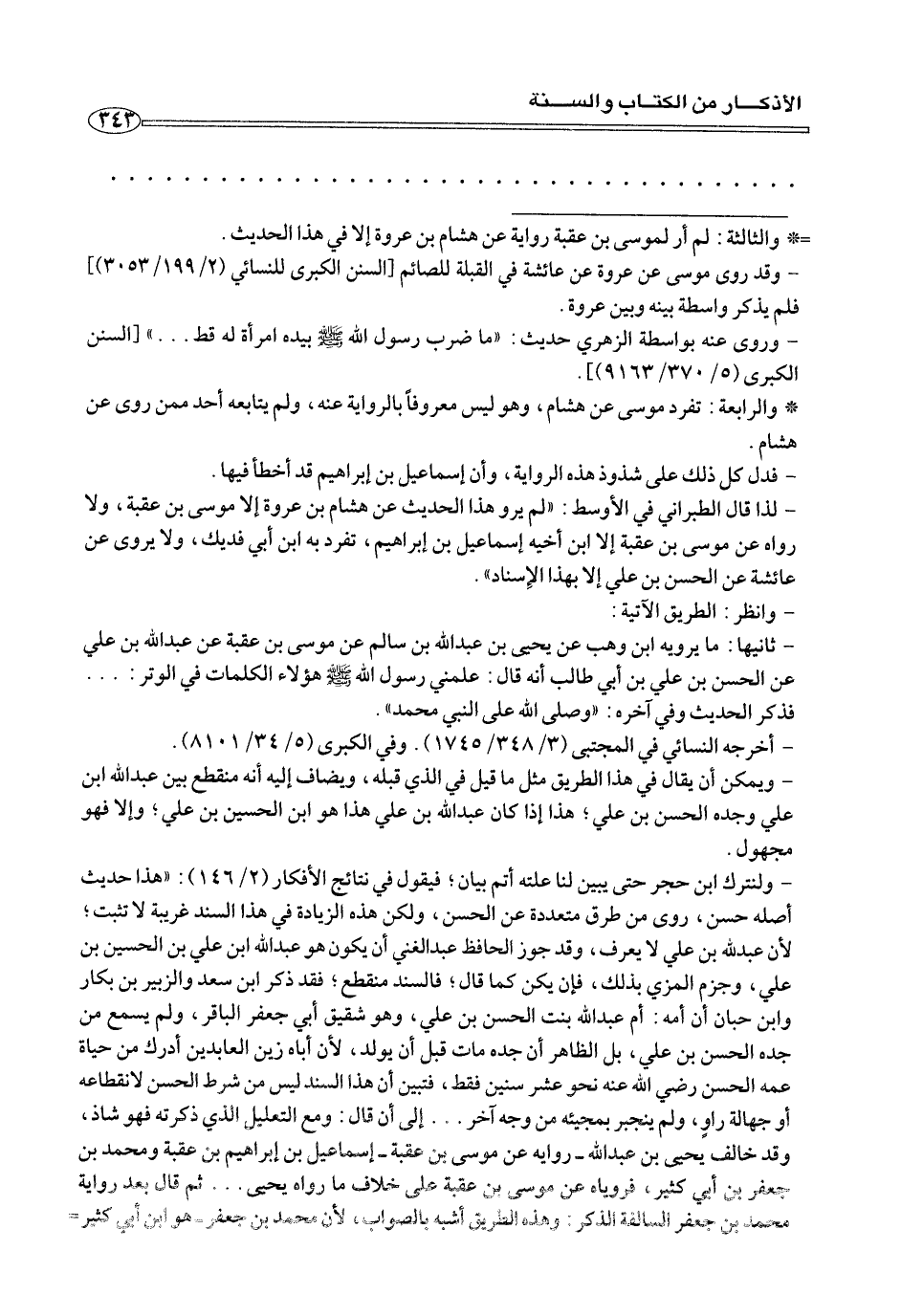 - ولنترك ابن حجر حتى يبين لنا علته أتم بيان، فيقول في نتائج الأفكار (٢/ ١٤٦).: (هذا حديث أصله حسن، روي من طرق متعددة عن الحسن، ولكن هذه الزيادة في هذا السند غريبة لا تثبت، لأن عبد الله بن علي لا يعرف، وقد جوز الحافظ عبد الغني أن يكون هو عبد الله بن علي بن الحسين بن علي، وجزم المزي بذلك، فإن يكن كما قال، فالسند منقطع، فقد ذكر بن سعد والزبير بن بكار وابن حبان أن امه: أم عبد الله بنت الحسين بن علي، وهو شقيق أبي جعفر الباقر، ولم يسمع من جده الحسن بن علي، بل الظاهر أن جده مات قبل أن يولد، لأن اباه زين العابدين أدرك من حياة عمه الحسن رضي الله عنه نحو عشر سنين فقط، فتبين أن هذا السند ليس من شرط الحسن لانقطاعه أو جهالة راو، ولم ينجبر بمجيئه من وجه آخر ... إلى أن قال: ومع التعليل الذي ذكرته فهو شاذ، وقد خالف يحيى بن عبد الله- رواية عن موسى بن عقبة- إسماعيل بن إبراهيم بن عقبة ومحمد بن جعفر بن أبي كثير، فروياه عن موسى بن عقبة على خلاف ما رواه يحي. .. ثم قال بعد رواية محمد بن جعفر السالفة الذكر: وهذه الطريق أشبه بالصواب، لأن محمد بن جعفر- هو ابن أبي كثير=