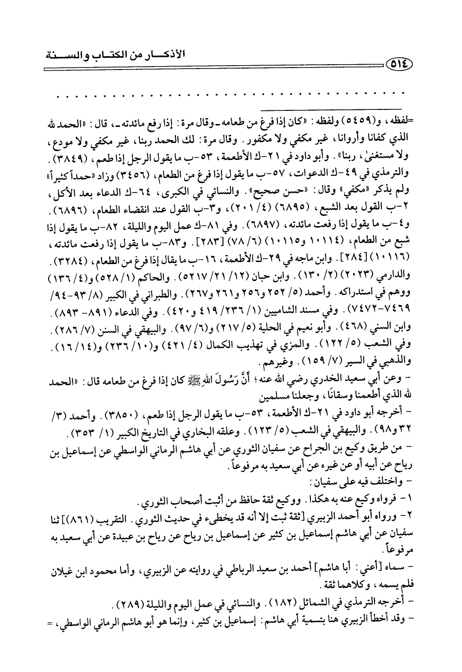 =لفظه، و (٥٤٥٩) ولفظه: «كان إذا فرغ من طعامه - وقال مرة: إذا رفع مائدته - قال: «الحمد لله الذي كفانا وأروانا، غير مكفي ولا مكفور، وقال مرة: لك الحمد ربنا، غير مكفي ولا مودع، ولا مستغنى، ربنا»، وأبو داود في ٢١ - ك الأطعمة، ٥٣ - ب ما يقول الرجل إذا طعم، (٣٨٤٩)، والترمذي في ٤٩ - ك، الدعوات، ٥٧ - ب ما يقول إذا فرغ من الطعام، (٣٤٥٦) وزاد «حمدًا كثيرًا» ولم يذكر «مكفي» وقال: «حسن صحيح»، والنسائي في الكبرى، ٦٤ - ك الدعاء بعد الأكل، ٢ - ب القول بعد الشبع، (٦٨٩٥) (٤/ ٢٠١)، و ٣ - ب القول عند انقضاء الطعام، (٦٨٩٦)، و ٤ - ب ما يقول إذا رفعت مائدته، (٦٨٩٧)، وفي ٨١ - ك عمل اليوم والليلة، ٨٢ - ب ما يقول شبع من الطعام، (١٠١١٤ و ١٠١١٥) (٦/ ٧٨) [٢٨٣]، و ٨٣ - ب ما يقول إذا رفعت مائدته، والدارمي (٢٠٢٣) (٢/ ١٣٠)، وابن حبان (١٢/ ٢١/ ٥٢١٧)، والحاكم (١/ ٥٢٨) و (٤/ ١٣٦) ووهم في استدراكه، وأحمد (٥/ ٢٥٢ و ٢٥٦ و ٢٦١ و ٢٦٧)، والطبراني في الكبير (٨/ ٩٣ - ٩٤/ ٧٤٦٩ - ٧٤٧٢)، وفي مسند الشاميين (١/ ٢٣٦ / ٤١٩ و ٤٢٠)، وفي الدعاء (٨٩١ - ٨٩٣)، وابن السني (٤٦٨)، وأبو نعيم في الحلية (٥/ ٢١٧) و (٦/ ٩٧)، والبيهقي في السنن (٧/ ٢٨٦)، وفي الشعب (٥/ ١٢٢)، والمزي في تهذيب الكمال (٤/ ٤٢١) و (١٠/ ٢٣٦) و (١٤/ ١٦)، والذهبي في السير (٧/ ١٥٩)، وغيرهم.