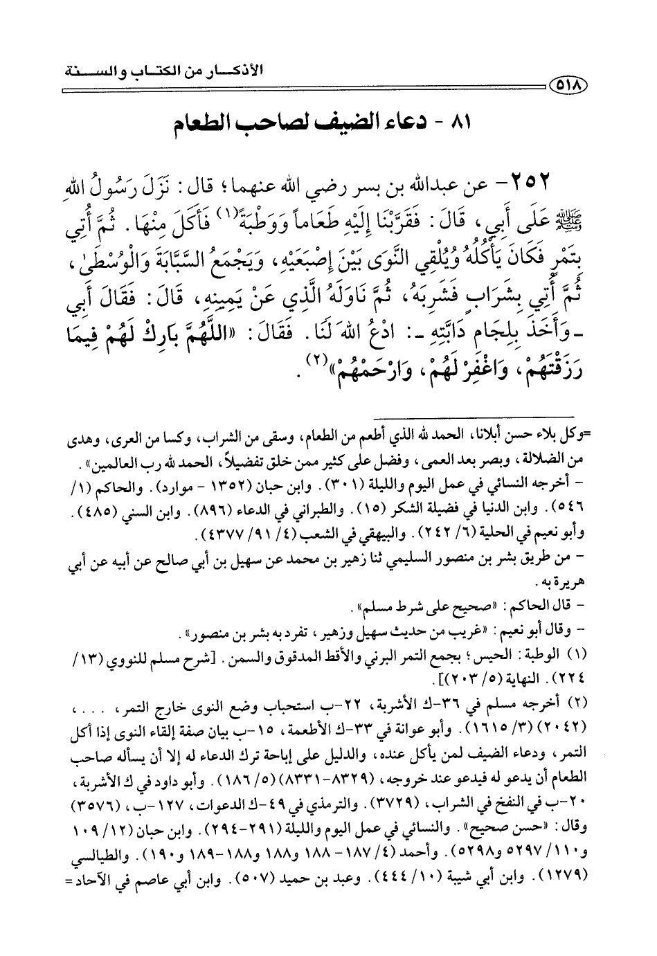 ٢٥٢ - عن عبد الله بن بسر رضي الله عنها؛ قَالَ نزلَ رَسُول اللَّهِ صلَّى اللَّهُ عليْهِ وسلَّمَ عَلَى أَبِي، قَالَ: فَقَرَّبْنَا إِلَيْهِ طَعَامًا وَوَطْبَةً (¬١) فَأَكلَ منها. ثُمَّ أُتِيَ بِتَمْرٍ فَكَانَ يَأْكُلُهُ وُيُلْقِي النَّوَى بَيْن إِصْبَعَيْه، ِ وَيَجْمَعُ السَّبَّابَةَ وَالْوُسْطَى، ثُمَّ أُتِيَ بِشَرَابٍ فَشَرِبَهُ ثُمَّ نَاوَلَهُ الَّذِي عَنْ يَمينِهِ، قَالَ فَقَالَ أَبِي- وَأخذَ بِلِجَامِ دَابَّتِهِ: ادْعُ اللهَ لَنَا. فَقَالَ: «اللَّهُمّ بَارِكْ لَهُمْ فِيمَا رَزَقْتَهُمْ وَاغْفِرْ لَهُمْ، وَارْحَمْهُمْ» (¬٢).