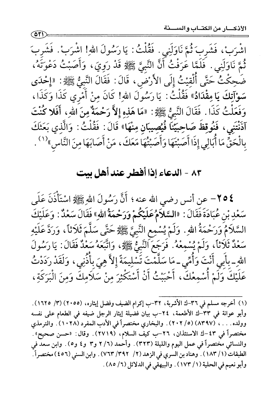 ٢٥٤ - عن أنس رضي الله عنه؛ أَنَّ رَسُولَ اللهِ صلى الله عليه وسلم اسْتَأْذَنَ عَلَى سَعْدِ بْنِ عُبَادَةَ فَقَالَ: «السَّلَامُ عَلَيْكُمْ وَرَحْمَةُ اللهِ» فَقَالَ سَعْدٌ: وَعَلَيْكَ السَّلَامُ وَرَحْمَةُ اللهِ. وَلَمْ يُسْمِعِ النَّبِيَّ صلى الله عليه وسلم حَتَّى سَلَّمَ ثَلَاثًا، وَرَدَّ عَلَيْهِ سَعْدٌ ثَلَاثًا، وَلَمْ يُسْمِعْهُ. فَرَجَعَ النَّبِيُّ صلى الله عليه وسلم، وَاتَّبَعَهُ سَعْدٌ فَقَالَ: يَا رَسُولَ اللهِ- بِأَبِي أَنْتَ وَأُمِّي- مَا سَلَّمْتَ تَسْلِيمَةُ إِلَاّ هِيَ بِأُذُنِي، وَلَقَدْ رَدَدْتُ عَلَيْهَ وَلَمْ أُسْمِعْكَ، أَحْبَبْتُ أَنْ أَسْتكْثِرَ مِنْ سَلَامِكَ وَمِنَ الْبَرَكَةِ،