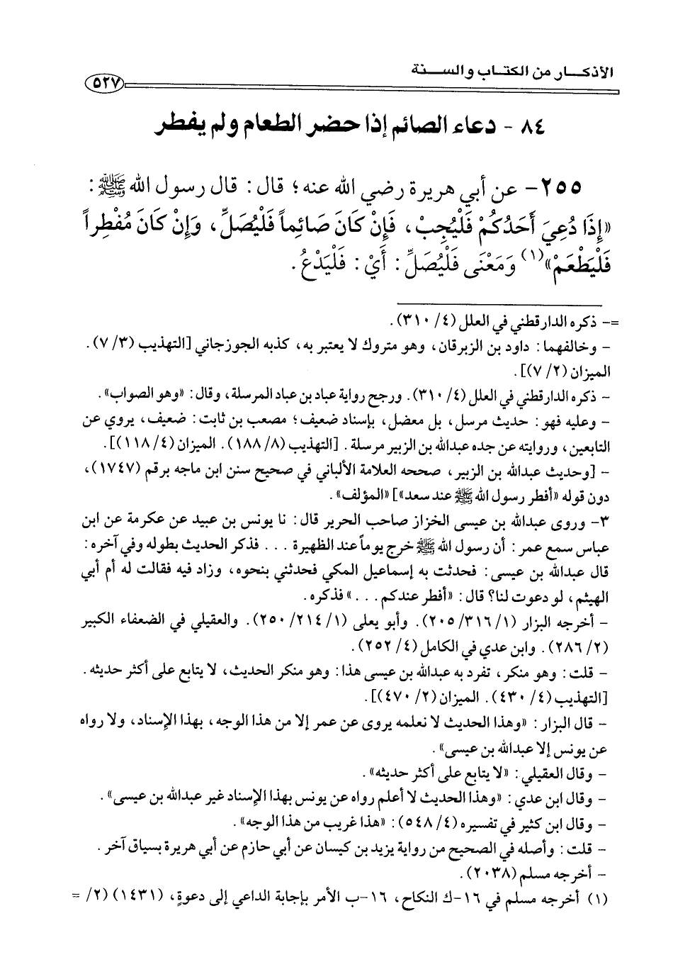 ٢٥٥ - عن أبي هريرة رضي الله عنه؛ قَالَ: قَالَ رَسُول الله صلى الله عليه وسلم: «إِذَا دُعِيَ أَحَدُكُمْ فَلْيُجِبْ، فَإِنَّ كَانَ صَائِمًا فَلْيُصَلِّ وَإِنْ كَانَ مُفطِرًا فلْيَطْعَمْ» (¬١) وَمَعْنَى فَلْيُصَلِّ: أَيْ فَلْيَدْعُ.