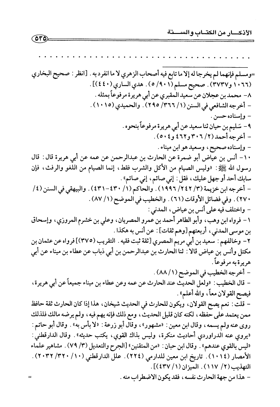 - قلت: نعم يصح القولان، ويكون للحارث في الحديث شيخان، هذا إذا كان الحارث ثقة حافظ ممن يعتمد على حفظه، لكنه كان قليل الحديث، ومع ذلك فإنه يهم فيه، ولم يرضه مالك فلذلك روى عنه ولم يسمه، وقال ابن معين: «مشهور»، وقال أبو زرعة: «لا بأس به». وقال أبو حاتم: «يروي عنه الدراوردي أحاديث منكرة، وليس بذاك القوي، يكتب حديثه». وقال الدارقطني: «ليس بالقوي عندهم». وقال ابن حبان: «من المتقنين» [الجرح والتعديل (٣/ ٧٩). مشاهير علماء الأمصار (١٠١٤). تاريخ ابن معين للدارمي (٢٢٤). علل الدارقطني (١٠/ ٣٢٠/ ٢٠٣٢). التهذيب (٢/ ١١٧). الميزان (١/ ٤٣٧)].