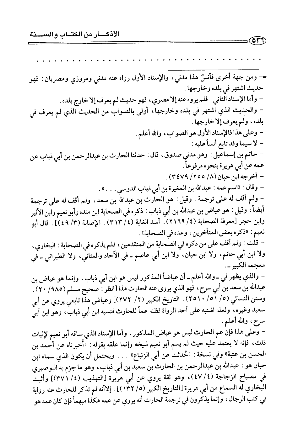 - وعلى هذا فإن عم الحارث ليس هو عياض المذكور، وأما الإسناد الذي ساقه أبو نعيم لإثبات ذلك، فإنه لا يعتمد عليه حيث لم يسم أبو نعيم شيخه وإنما علقه بقوله: «أُخبرناه عن أحمد بن الحسن بن عتبة» وفي نسخة: «حُدثت عن أبي الزنباع» ... ويحتمل أن يكون الذي سماه ابن حبان هو: عبد الله بن عبد الرحمن بن الحارث بن سعيد بن أبي ذباب، وهو ما جزم به البوصيري في مصباح الزجاجة (٤/ ٤٧)، وهو ثقة يروي عن أبي هريرة [التهذيب (٤/ ٣٧١)] وأثبت البخاري له السماع من أبي هريرة [التاريخ الكبير (٥/ ١٣٢)]. إلا أنه لم تذكر للحارث عنه رواية في كتب الرجال، وإنما يذكرون في ترجمة الحارث أنه يروي عن عمه هكذا مبهمًا فإنه كان عمه هو=