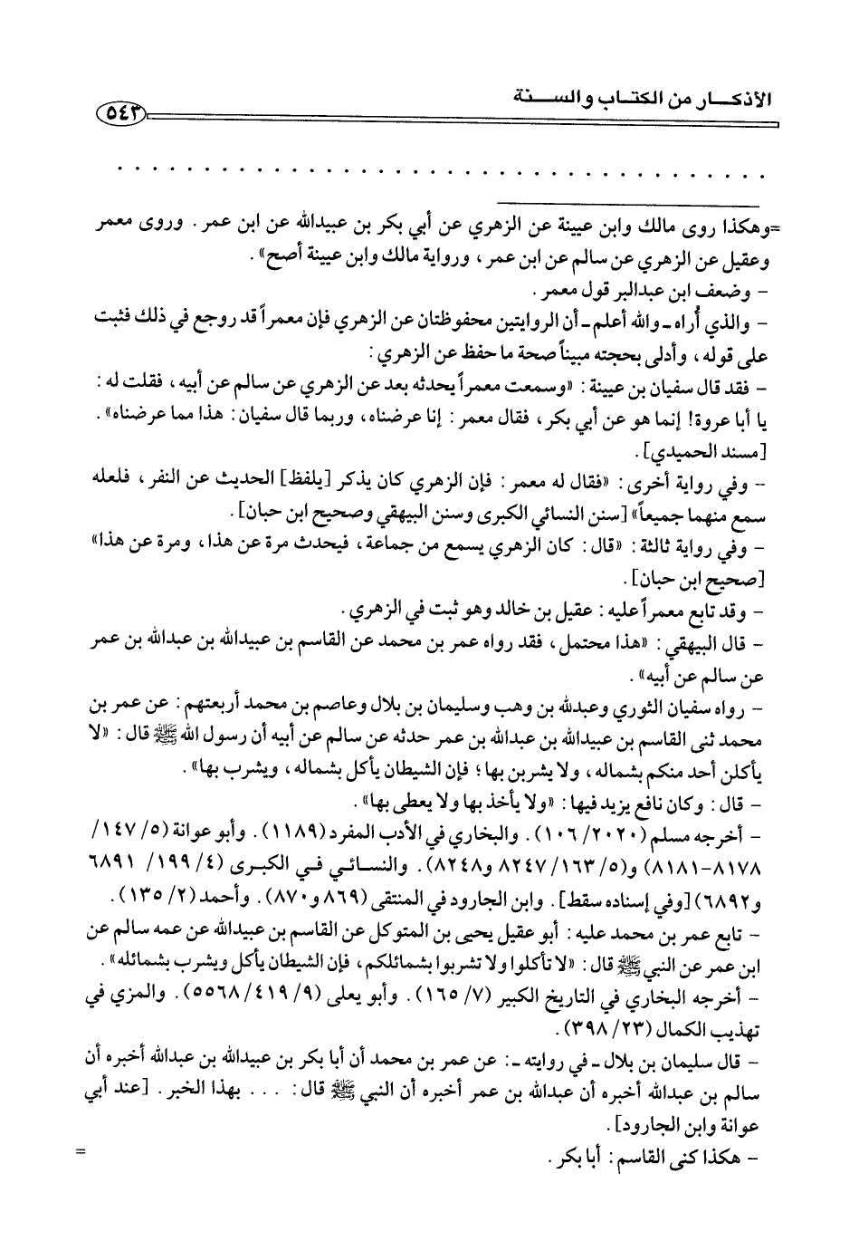 - وراه سفيان الثوري وعبد لله بن وهب وسليمان بن بلال وعاصم بن محمد أربعتهم: عن عمر بن محمد ثنى القاسم بن عبيد الله بن عبد الله عمر حدثه عن سالم عن أبيه أن رسول الله صلى الله عليه وسلم قال: «لا يأكلن أحد منكم بشماله، ولا يشربن بها؛ فإن الشيطان يأكل بشماله، يشرب بها».