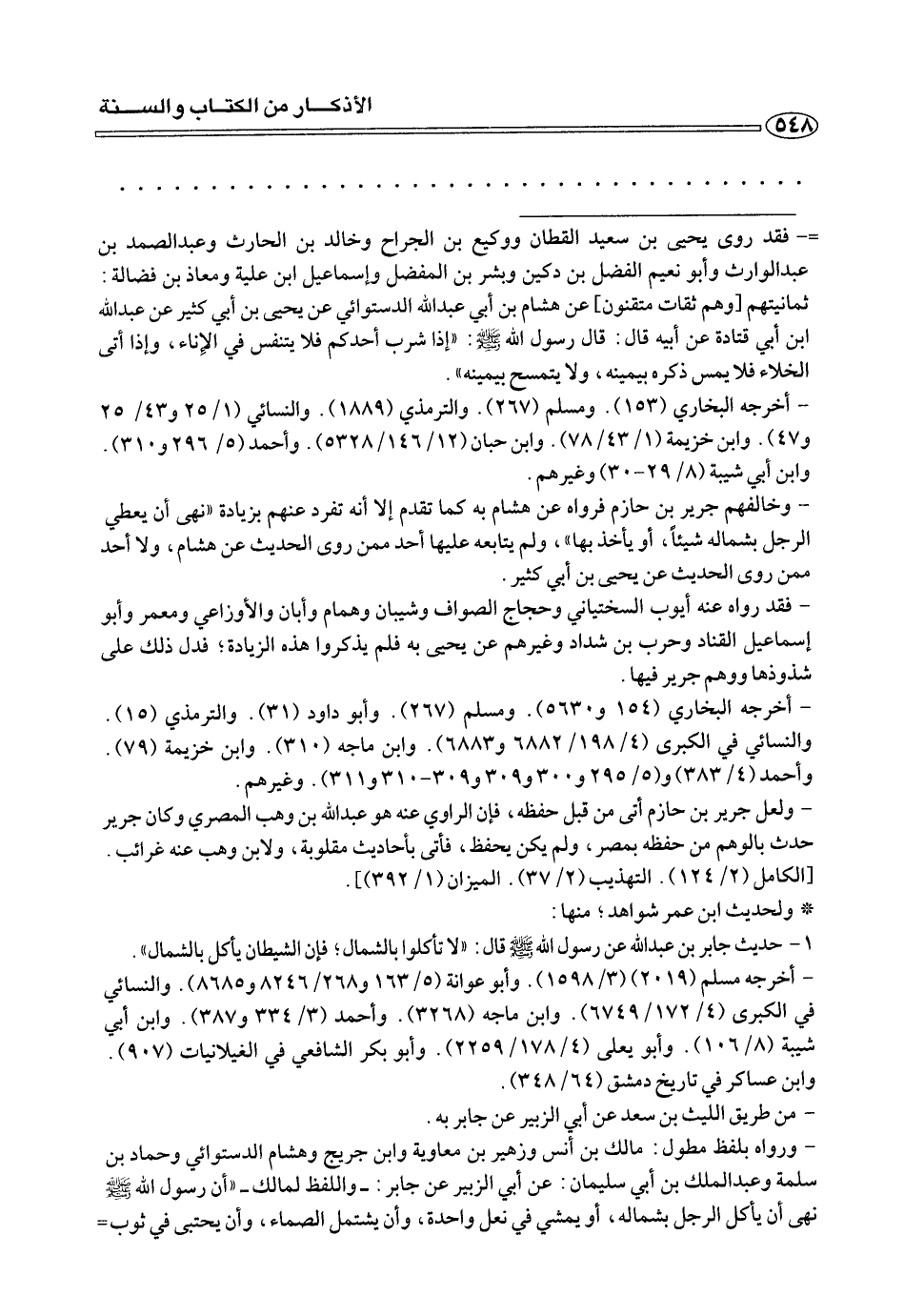 =- فقد روى يحيى بن سعيد القطان ووكيع بن الجراح وخالد بن الحارث وعبد الصمد بن عبد الوارث وأبو نعيم الفضل بن دكين وبشر بن المفضل وإسماعيل ابن علية ومعاذ بن فضالة: ثمانيتهم [وهم ثقات متقنون] عن هشام بن أبي عبد الله الدستوائي عن يحيى بن أبي كثير عن عبد الله ابن أبي قتادة عن أبيه قال: قال رسول الله صلى الله عليه وسلم: «إذا شرب أحدكم فلا يتنفس في الإناء، وإذا أتى الخلاء فلا يمس ذكره بيمينه، ولا يتمسح بيمينه».