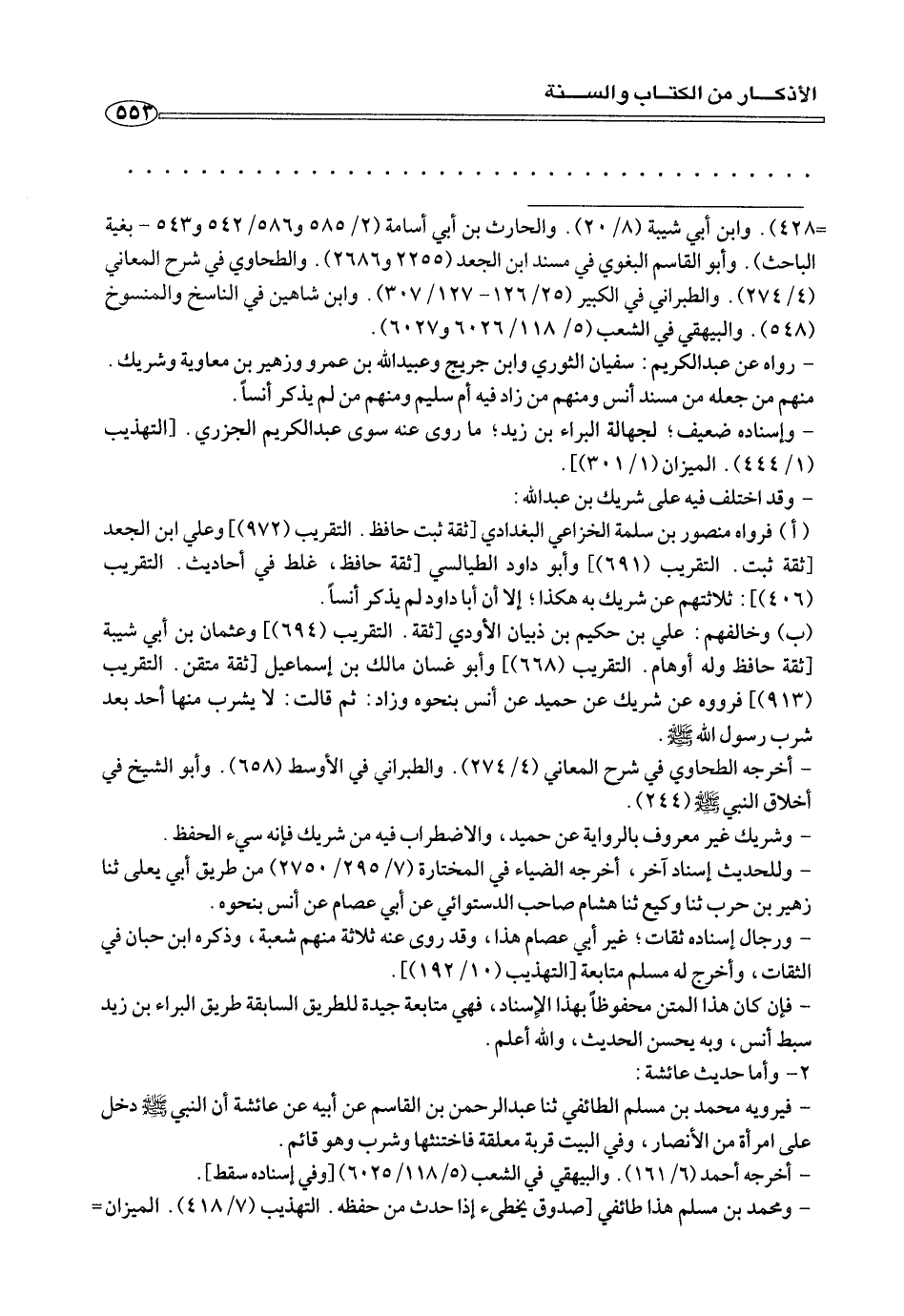 (ب) وخالفهم: علي بن حكيم بن ذبيان الأودي [ثقة. التقريب (٦٩٤)] وعثمان بن أبي شيبة [ثقة حافظ وله أوهام. التقريب (٦٦٨)] وأبو غسان مالك بن إسماعيل [ثقة متقن. التقريب (٩١٣) فرووه عن شريك عن حميد عن أنس بنحوه وزاد: ثم قالت: لا يشرب منها أحد بعد شرب رسول الله صلى الله عليه وسلم.
