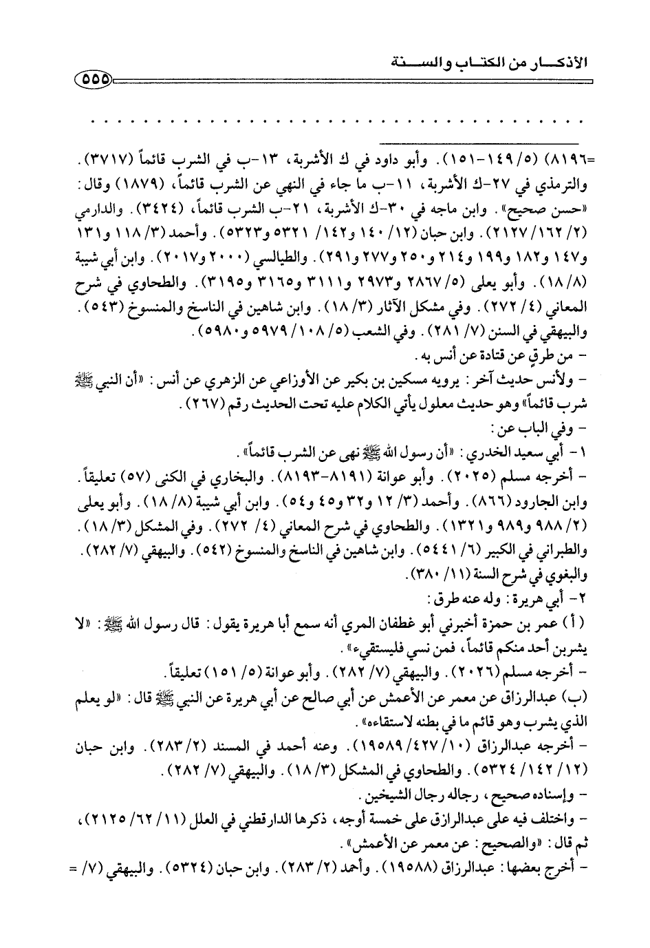 =٨١٩٦) (٥/ ١٤٩ - ١٥١). وأبو داود في ك الأشربة، ١٣ - ب في الشرب قائمًا (٣٧١٧). والترمذي في ٢٧ - ك الأشربة، ١١ - ب ما جاء في النهي عن الشرب قائمًا، (١٨٧٩) وقال: «حسن صحيح». وابن حبان (١٢/ ١٤٠ و ١٤٢/ ٥٣٢١ و ٥٣٢٣). وأحمد (٣/ ١١٨ و ١٣١ و ١٤٧ و ١٨٢ و ١٩٩ و ٢ ١٤ و ٢٥٠ و ٢٧٧ و ٢٩١). والطيالسي (٢٠٠٠ و ٢٠١٧). وابن أبي شيبة (٨/ ١٨). وأبو يعلى (٥/ ٢٨٦٧ و ٢٩٧٣ و ٣١١١ و ٣١٦٥ و ٣١٩٥). والطحاوي في شرح المعاني (٤/ ٢٧٢). وفي نشكل الآثار (٣/ ١٨). وابن شاهين في الناسخ والمنسوخ (٥٤٣). والبيهقي في السنن (٧/ ٢١٨). وفي الشعب (٥/ ١٠٨/ ٥٩٧٩ و ٥٩٨٠).