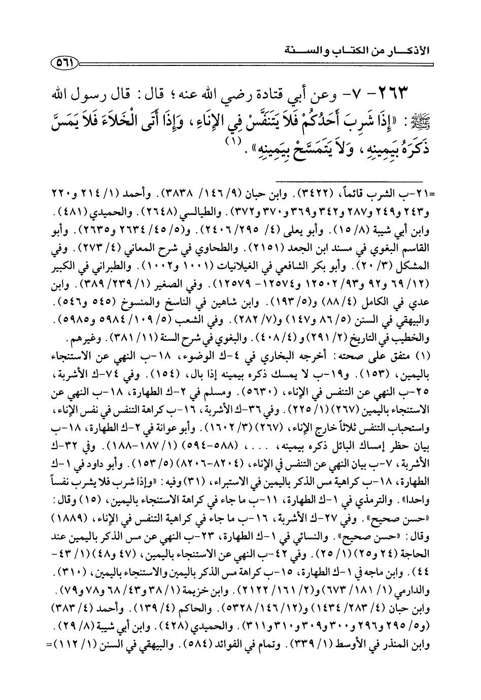 ٢٦٣ - ٧ - وعن أبي قتادة رضي الله عنه؛ قال: قال رسول الله صلى الله عليه وسلم: «إِذَا شَرِبَ أَحَدُكُمْ فَلَا يَتَنَفَّسْ فِي الإِنَاءِ، وإِذَا أَتَى الْخَلَاءَ فَلَا يَمَسَّ ذَكَرَهُ بيَمِيِنِهِ، وَلَا يَتَمَسَّحْ بِيَمِيِنِهِ». (¬١)