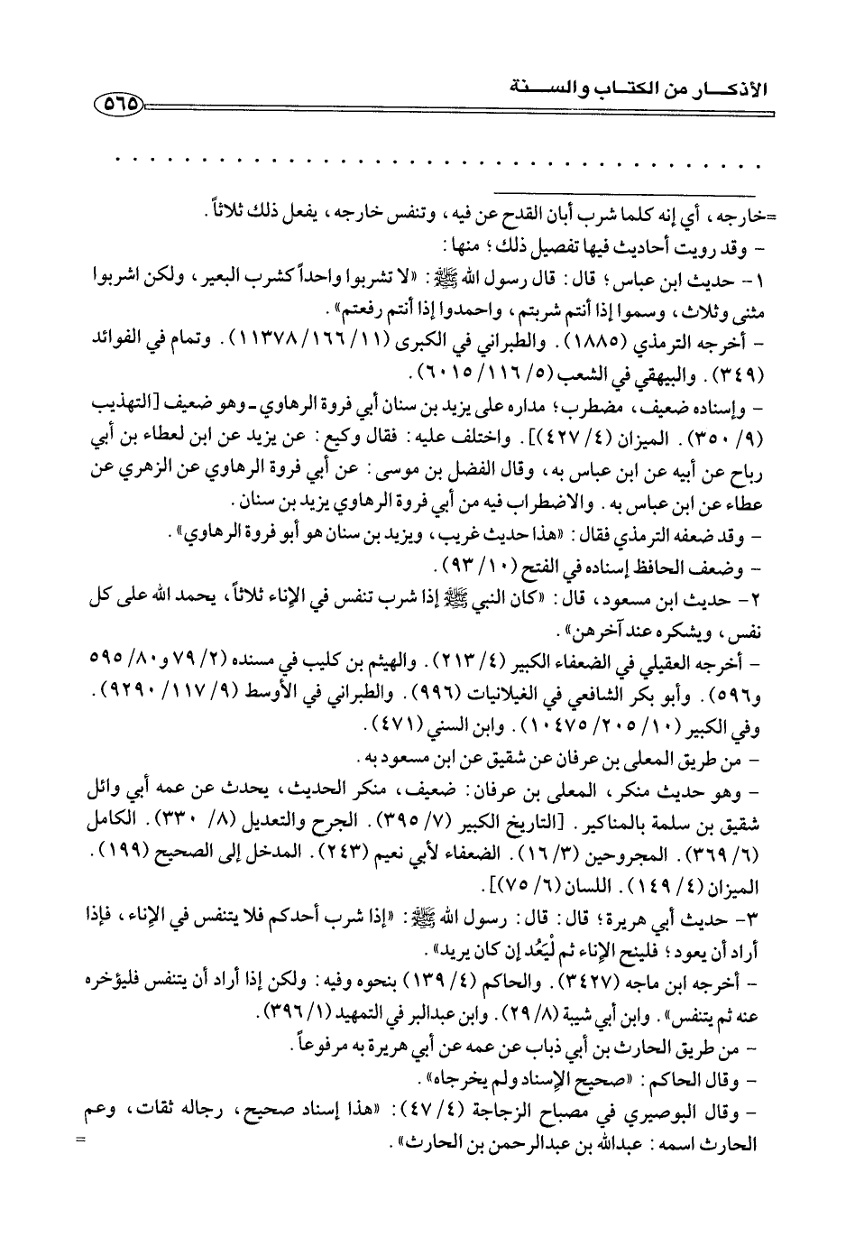 ١ - حديث ابن عباس، قال: قال رسول الله صلى الله عليه وسلم: «لا تشربوا واحدًا كشرب البعير، ولكن اشربوا مثنى وثلاث، وسموا إذا أنتم شربتم، واحمدوا إذا أنتم رفعتم».