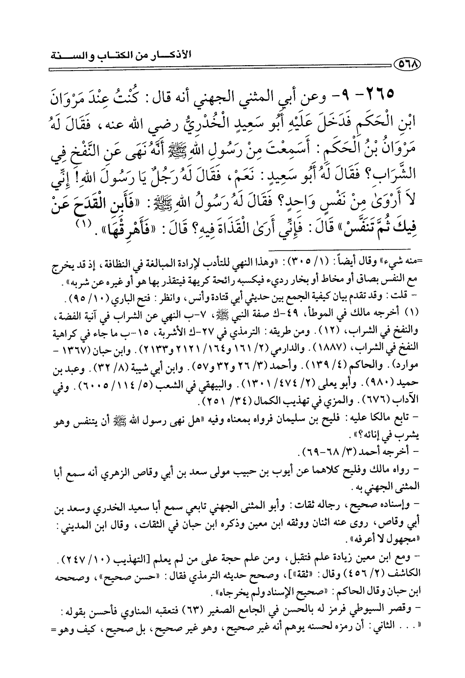 ٢٦٥ - ٩ - وعن أبن المثني الجهني أنه قال: كُنْتُ عِنْدَ مَرْوَانَ ابْنِ الْحَكَمِ فَدَخَلَ أَبُو سَعِيدٍ الْخُدْرِيُّ رضي الله عنه، فَقَالَ لَهُ مَرْوَانُ بْنُ الْحَكَمِ: أَسَمِعْتَ مِنْ رَسُولِ اللهِ صلى الله عليه وسلم أَنَّهُ نَهَى عَنِ النَّفْخِ فِي الشَّرَابِ؟ فَقَالَ لَهُ أَبُو سَعِيدٍ: نَعَمْ، فَقَالَ لَهُ رَجُلٌ يَا رَسُول الله! إِنِّي لَا أَرْوَى مِنْ نَفْسٍ وَاحِدٍ؟ فَقَالَ لَهُ رَسُولُ الله صلى الله عليه وسلم: «فَأَبِنِ الْقَدَحَ عَنْ فِيكَ ثُمَّ تَنَفَّسْ» قَالَ: فَإِنِّي أَرَى الْقَذَاةَ فِيهِ؟ قَالَ: «فَأَهْرِقْهَا» (¬١) .