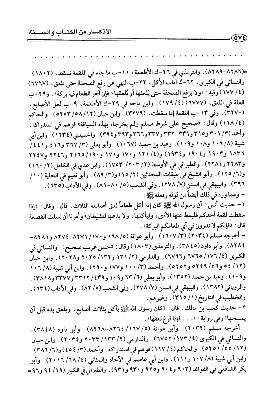 ٢ - حديث كعب بن مالك: قال: «كان رسول الله صلى الله عليه وسلم يأكل بثلاث أصابع، ويلعق يده قبل أن يمسحها» وفي رواية: « ... فإذا فرغ لعقها».