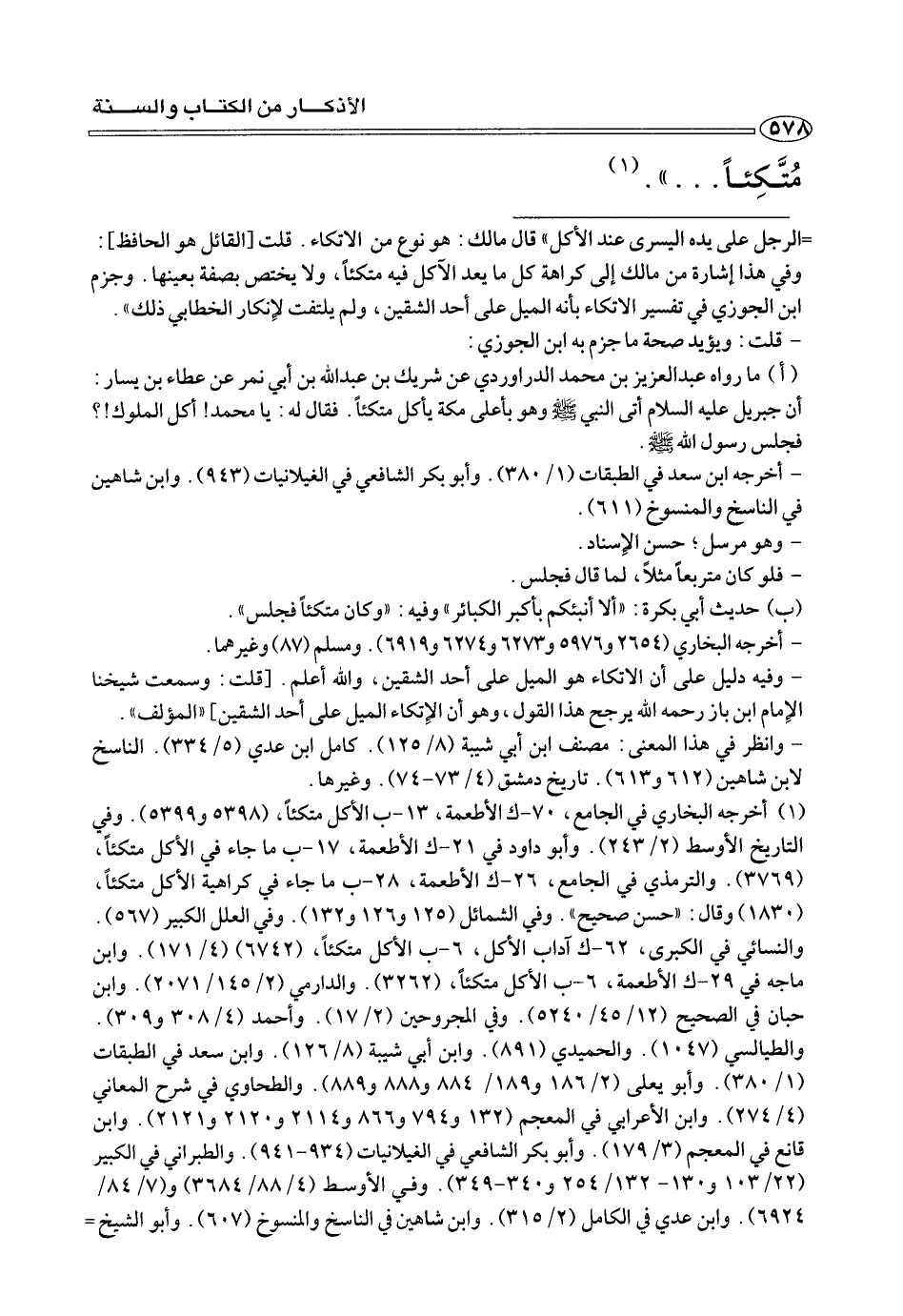 (¬١) أخرجه البخاري في الجامع، ٧٠ - ك الأطعمة، ١٣ - ب الأكل متكئا، (٥٣٩٨ و ٥٣٩٩). وفي التاريخ الأوسط (٢/ ٢٤٣). وأبو داود في ٢١ - ك الأطعمة، ١٧ - ب ما جاء في الأكل متكئا، (٣٧٦٩). والترمذي في الجامع، ٢٦ - ك الأطعمة، ٢٨ - ب ما جاء في كراهية الأكل متكئا، (١٨٣٠) وقال: «حسن صحيح». وفي الشمائل (١٢٥ و ١٢٦ و ١٣٢). وفي العلل الكبير (٥٦٧). والنسائي في الكبرى، ٦٢ - ك آداب الأكل، ٦ - ب الأكل متكئا، (٦٧٤٢) (٤/ ١٧١). وابن ماجه في ٢٩ - ك الأطعمة، ٦ - ب الأكل متكئا، (٣٢٦٢). والدارمي (٢/ ١٤٥/ ٢٠٧١). وابن حبان في الصحيح (١٢/ ٤٥/ ٥٢٤٠). وفي المجروحين (٢/ ١٧). وأحمد (٤/ ٣٠٨ و ٣٠٩). والطيالسي (١٠٤٧). والحميدي (٨٩١). وابن أبي شيبة (٨/ ١٢٦). وابن سعد في الطبقات (١/ ٣٨٠). وأبو يعلى (٢/ ١٨٦ و ١٨٩/ ٨٨٤ و ٨٨٨ و ٨٨٩). والطحاوي في شرح المعاني (٤/ ٢٧٤). وابن الأعرابي في المعجم (١٣٢ و ٧٩٤ و ٨٦٦ و ٢١١٤ و ٢١٢٠ و ٢١٢١). وابن قانع في المعجم (٣/ ١٧٩). وأبو بكر الشافعي في الغيلانيات (٩٣٤ - ٩٤١). والطبراني في الكبير (٢٢/ ١٠٣ و ١٣٠ - ١٣٢/ ٢٥٤ و ٣٤٠ - ٣٤٩). وفي الأوسط (٤/ ٨٨/ ٣٦٨٤) و (٧/ ٨٤/ ٦٩٢٤). وابن عدي في الكامل (٢/ ٣١٥). وابن شاهين في الناسخ والمنسوخ (٦٠٧). وأبو الشيخ=