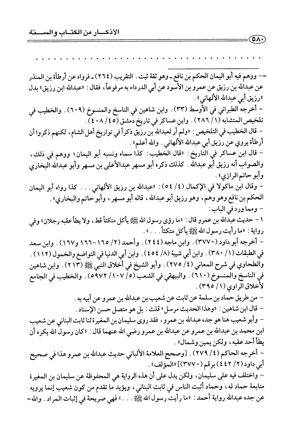 =- ووهم فيه أبو اليمان الحكم بن نافع- وهو ثقة ثبت. التقريب (٢٦٤) - فرواه عن أرطأة بن المنذر عن عبد الله بن رزيق عن عمرو بن الأسود عن أبي الدرداء به مرفوعا، فقال: «عبد الله ابن رزيق» بدل «رزيق أبي عبد الله الألهاني».